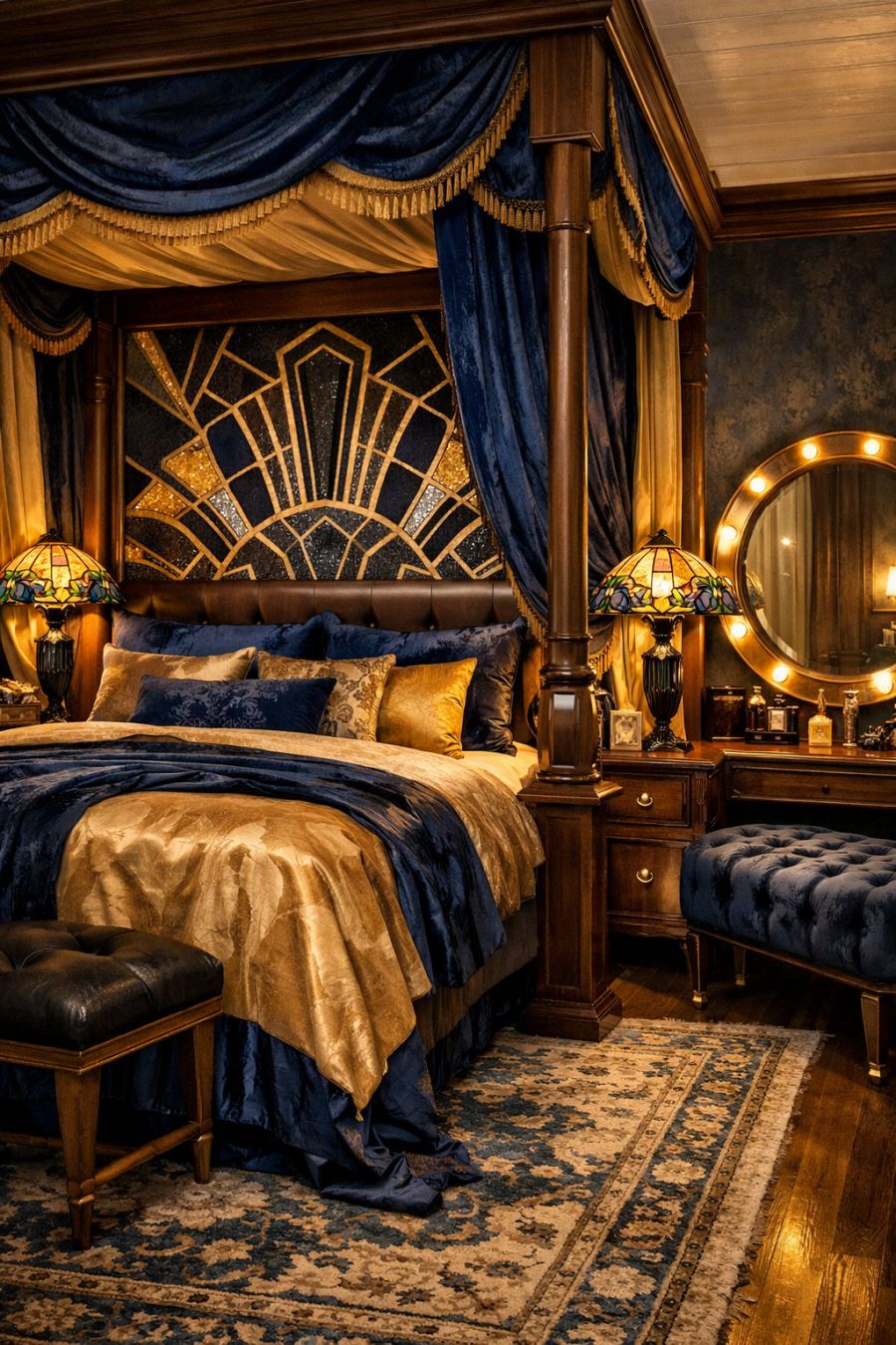 In the bedroom, luxury takes center stage with a grand, four-poster bed draped in sumptuous fabrics of deep blues and golds. The headboard is an intricate tapestry of geometric patterns, a nod to classic Art Deco motifs. Soft, ambient lighting is achieved through artfully placed lamps with stained glass shades, casting a gentle glow throughout the space. A vanity with a large, circular mirror and a velvet-tufted bench offers a chic spot for getting ready, while a plush area rug underfoot adds warmth and texture.