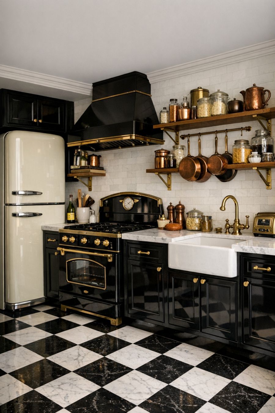 The kitchen is a seamless blend of modern convenience and vintage style, featuring sleek black and white checkered flooring and glossy black cabinetry. The countertops are a stunning white marble, offering ample space for meal preparation while maintaining an air of sophistication. Brass fixtures and hardware add a touch of warmth and elegance, echoing the Art Deco theme. A vintage-inspired refrigerator and stove provide the heart of the kitchen, while open shelving displays an assortment of copper cookware and decorative glass jars.