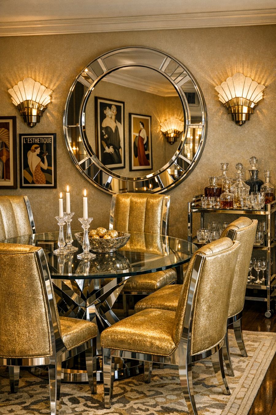 The dining area continues the Art Deco theme with a stunning glass and chrome dining table, surrounded by high-backed chairs upholstered in shimmering gold fabric. The walls are adorned with vintage art prints, and a large, circular mirror serves as a focal point, enhancing the room's elegant atmosphere. A sleek bar cart in one corner holds an array of crystal glassware and decanters, ready for entertaining in style. The lighting is soft and ambient, provided by wall sconces with intricate, fan-shaped designs reminiscent of the period.
