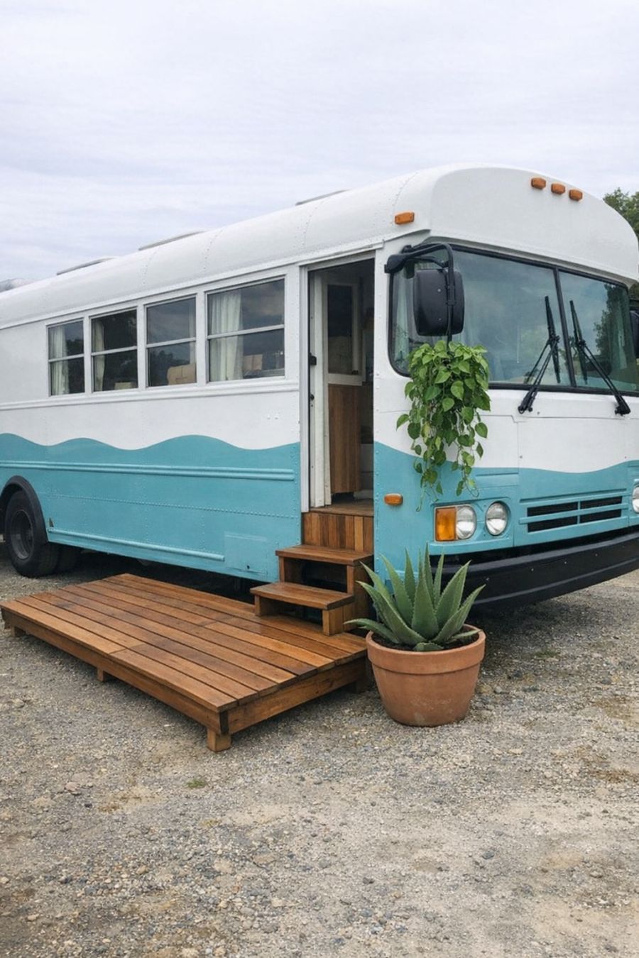 The exterior of this converted bus is a harmonious blend of crisp white and sea glass blue, evoking the gentle waves of a coastal paradise. Its minimalist design is accentuated by the fold-out teak wood deck, providing an inviting space to enjoy the sea breeze. Trailing pothos plants hang gracefully from the side mirrors, adding a touch of nature's elegance to the sleek exterior. Positioned by the step is a large potted aloe vera plant, completing the coastal aesthetic with a hint of greenery. This unique design is captured beautifully in an amateur photograph, showcasing the bus from a 3/4 angled view.