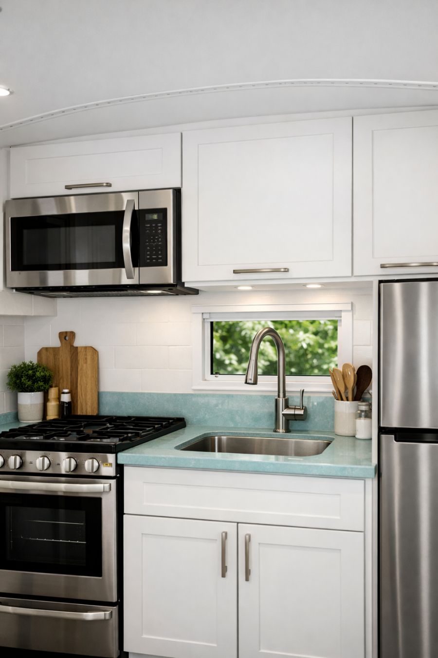 The kitchen area is a masterclass in maximizing space without compromising on style. Crisp white cabinetry provides ample storage, while the countertops, made from durable materials with a subtle sea glass blue tint, offer a practical and visually appealing workspace. State-of-the-art stainless steel appliances are seamlessly integrated, ensuring functionality without overpowering the minimalist design. A small window above the sink brings in natural light, enhancing the airy feel of the space.