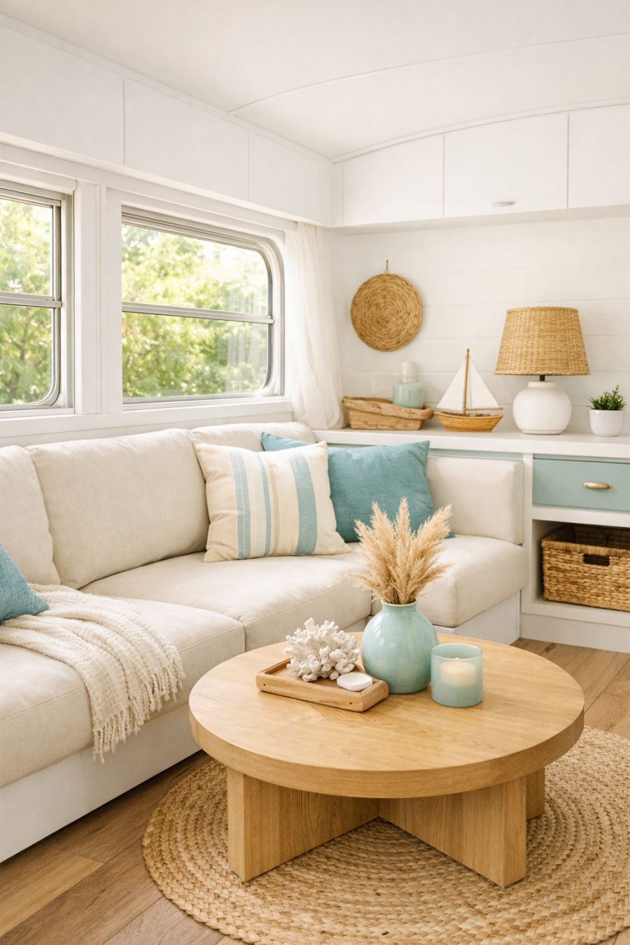 The dining area is seamlessly integrated into the open plan layout, featuring a compact yet functional design. A sleek, foldable table in light wood tones complements the minimalist aesthetic while providing ample space for meals. The seating, upholstered in soft, sea glass blue fabric, adds a touch of color and comfort. Above, a modern pendant light fixture casts a warm glow, creating an inviting atmosphere for dining. The decor is kept simple, with a few nautical-inspired accents to maintain the coastal theme.