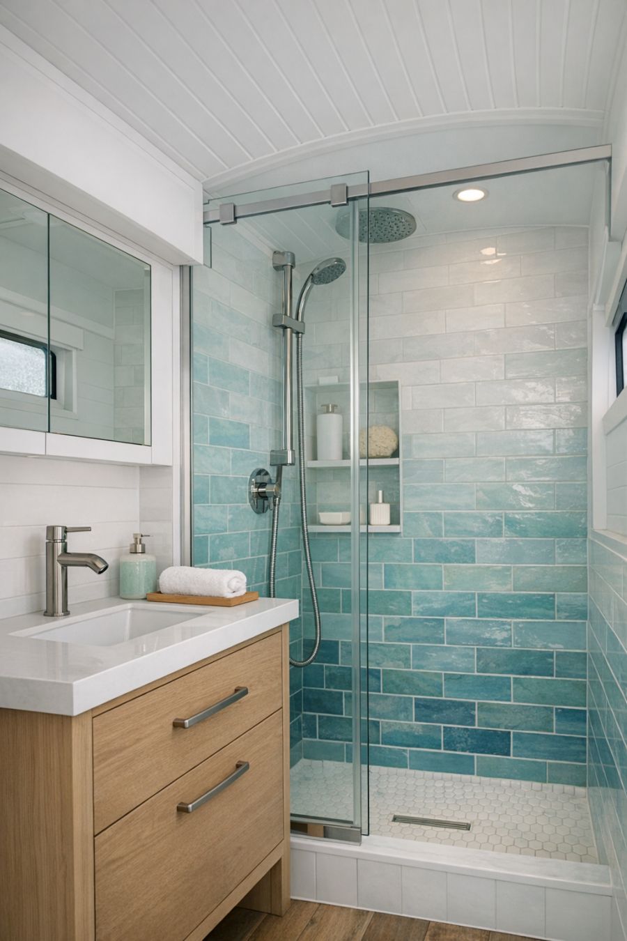 The bathroom area is a testament to minimalist elegance, featuring sleek, modern fixtures that complement the overall design. The color scheme is a continuation of the crisp white and sea glass blue, with tiles that mimic the gentle hues of the ocean. A compact yet stylish vanity offers storage, while the shower area is enclosed with clear glass to maintain an open feel. The use of high-quality materials and thoughtful layout ensures the bathroom is both functional and aesthetically pleasing, providing a refreshing space to start or end the day.