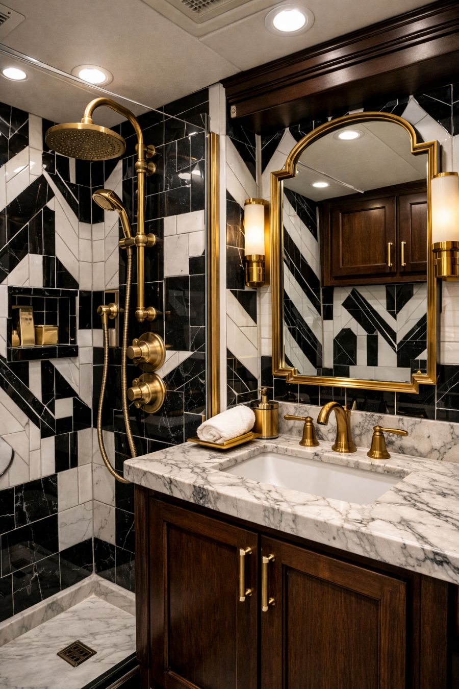 The bathroom is a testament to the fusion of functionality and style, featuring exquisite materials and a thoughtful layout. The walls are clad in glossy black and white tiles, arranged in an eye-catching geometric pattern that pays homage to the Art Deco aesthetic. A spacious shower with brass fixtures and a rainfall showerhead provides a luxurious bathing experience. The vanity is topped with a marble counter and an elegant brass-framed mirror, offering both practicality and sophistication. This carefully curated space ensures that even the daily routine of self-care is elevated to an art form.