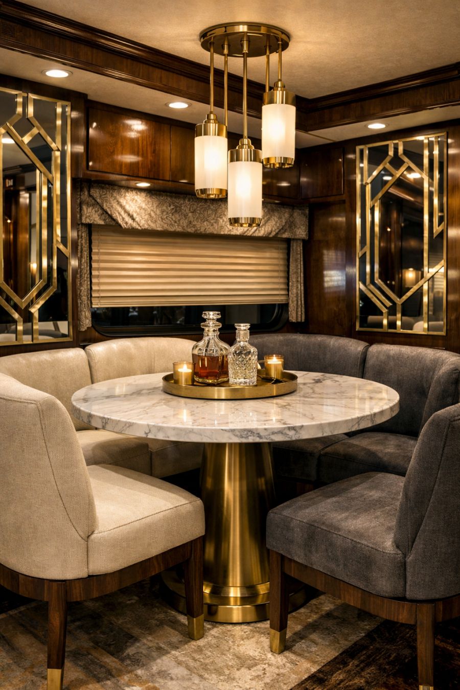 The RV also features a cozy reading nook, complete with a built-in bookshelf and a comfortable armchair upholstered in rich velvet. This serene corner is perfect for unwinding with a good book, surrounded by the elegance of brass accents and warm wood tones. Additionally, a small workspace is included, providing a stylish and functional area for productivity on the road.