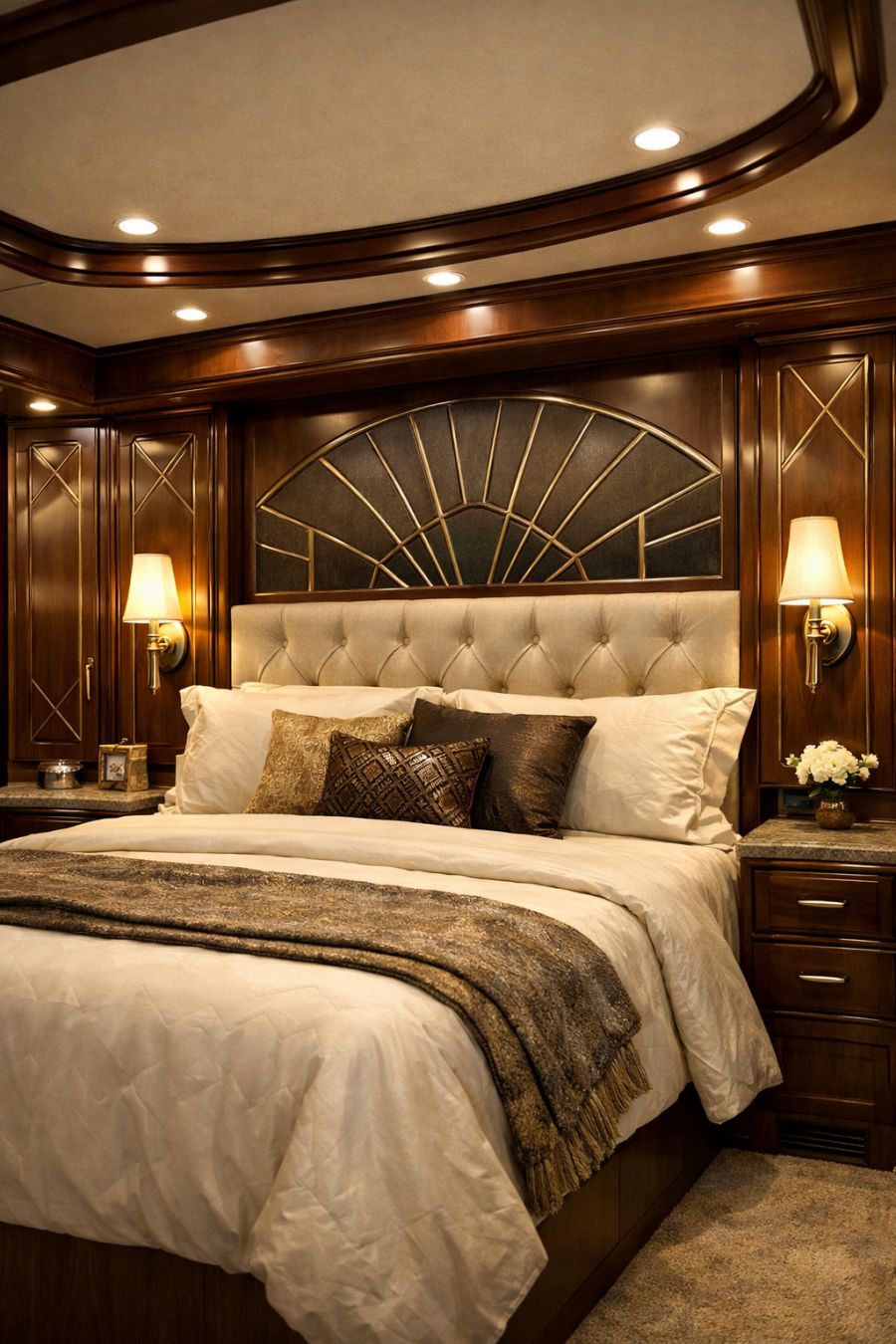 The bedroom area is a sanctuary of luxury and tranquility. A plush, king-sized bed takes center stage, draped in sumptuous linens and surrounded by rich wood paneling. Brass sconces on either side provide soft, ambient lighting, creating a warm and inviting atmosphere. The Art Deco theme is evident in the geometric patterns etched into the headboard and the sleek lines of the built-in wardrobes, offering both style and practicality. It's a space designed for rest and rejuvenation, enveloping you in comfort and elegance.