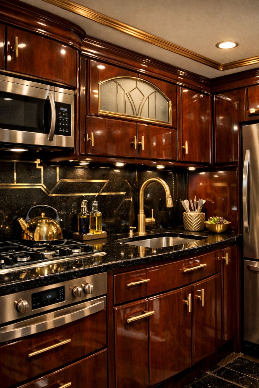 In the kitchen, the Art Deco influences continue with a blend of modern convenience and vintage charm. High-gloss cabinetry in a rich mahogany finish provides ample storage, while brass hardware adds a touch of elegance. The countertops are crafted from polished black granite, offering both durability and style. State-of-the-art appliances are seamlessly integrated into the design, ensuring that the kitchen is as functional as it is beautiful, making it the perfect place to prepare gourmet meals on the go.