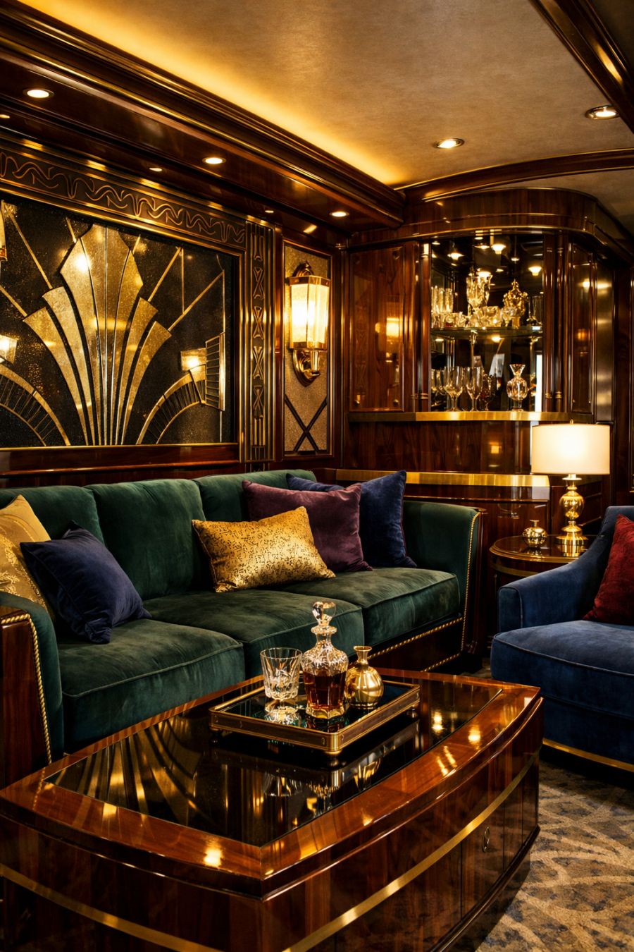 Step inside, and you'll be transported to a world of glamorous Art Deco sophistication. The living area is adorned with rich brass accents that catch the light and create a warm, inviting glow. Luxurious velvet upholstery in deep jewel tones contrasts elegantly with polished wood finishes, creating a sense of opulence and comfort. The walls are adorned with intricate geometric patterns, characteristic of the Art Deco style, providing a stunning visual backdrop that transforms the space into a chic retreat.