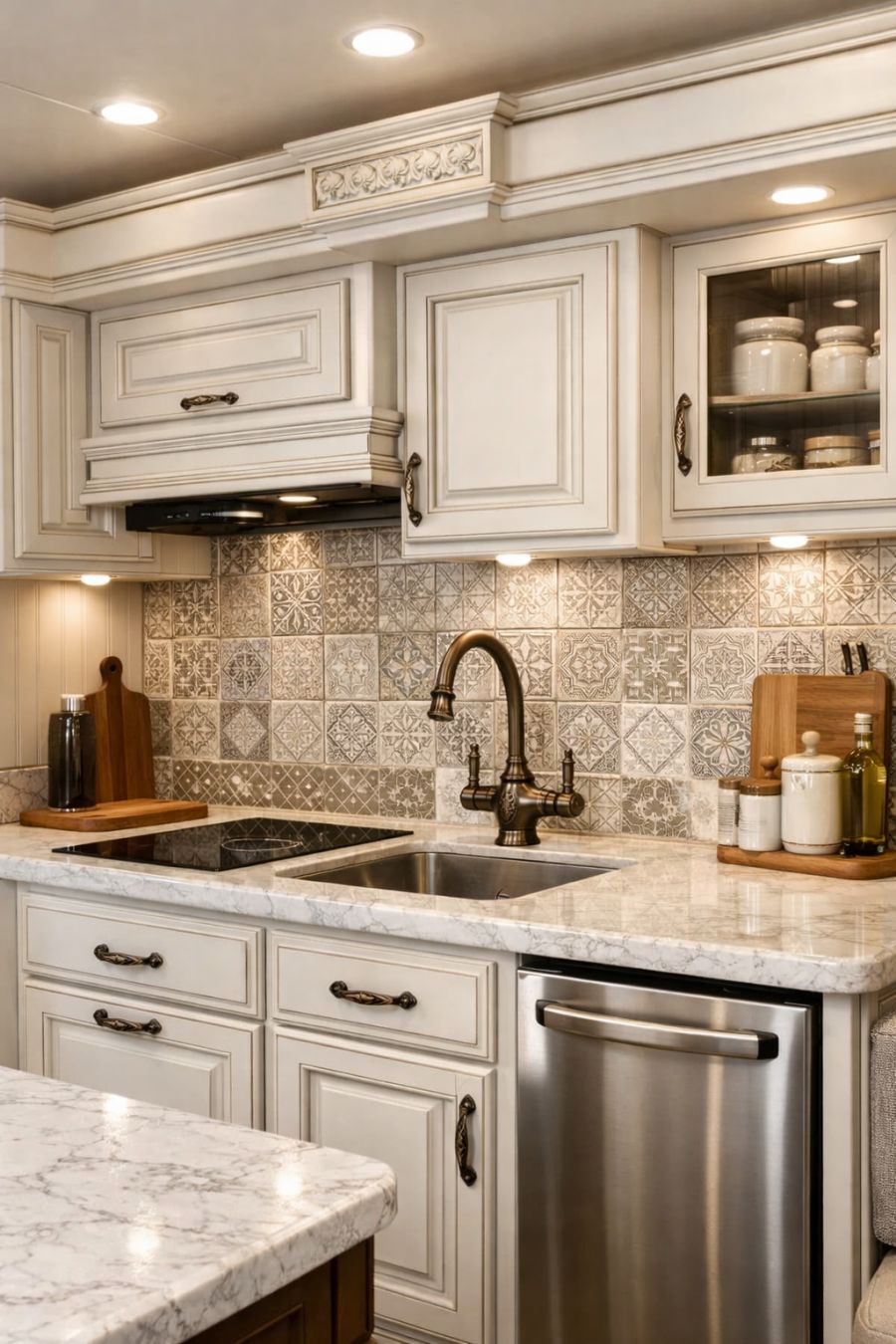 The kitchen is a masterpiece of functionality and style, seamlessly integrated into the RV's layout. White cabinetry with ornate detailing provides ample storage, while a polished marble countertop offers a sleek workspace. Modern appliances are cleverly concealed to maintain the aesthetic flow, and an antique-style faucet adds a touch of vintage flair. The backsplash, adorned with intricate tile work in muted tones, ties the space together, creating a kitchen that is as beautiful as it is practical.