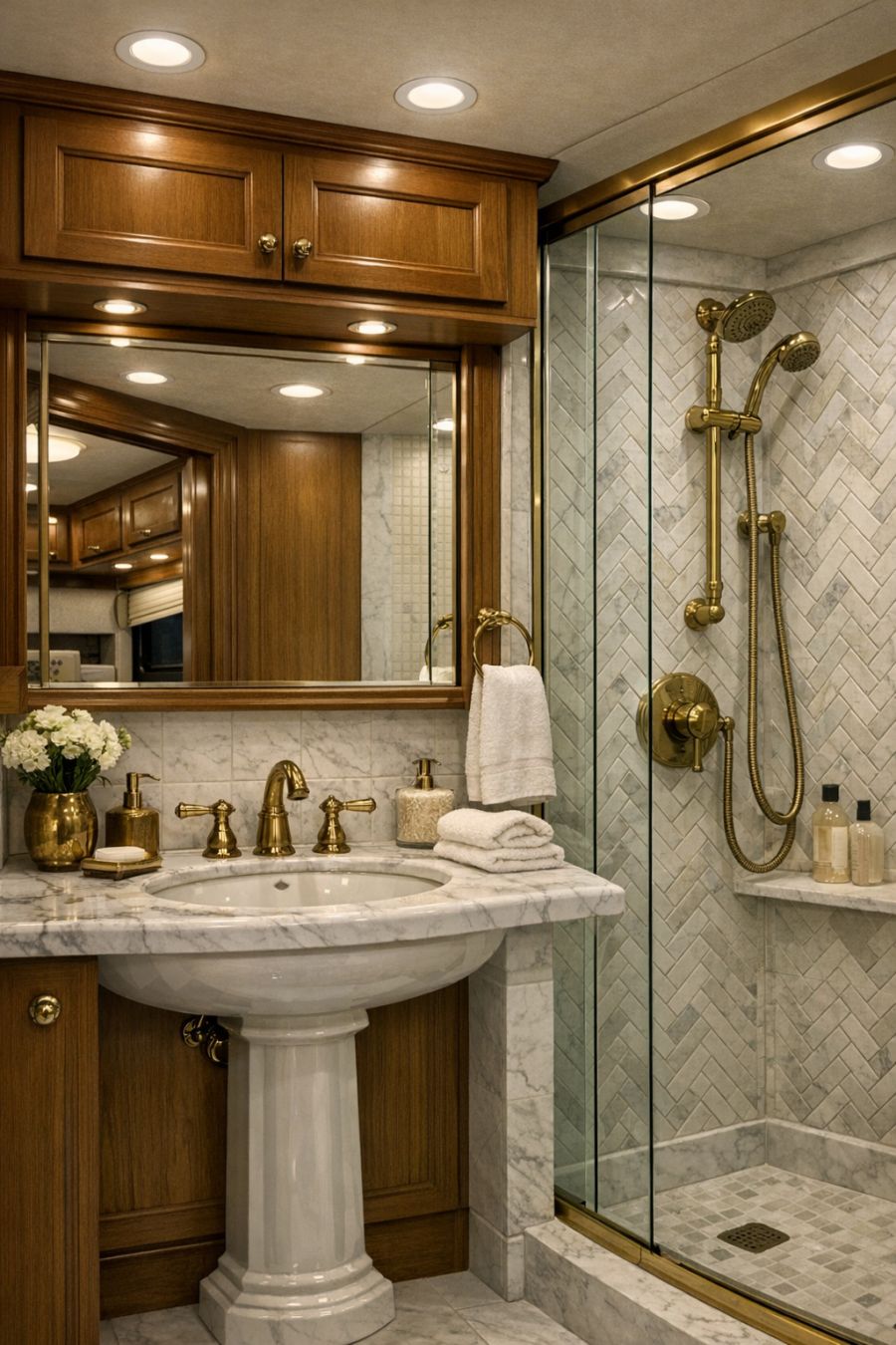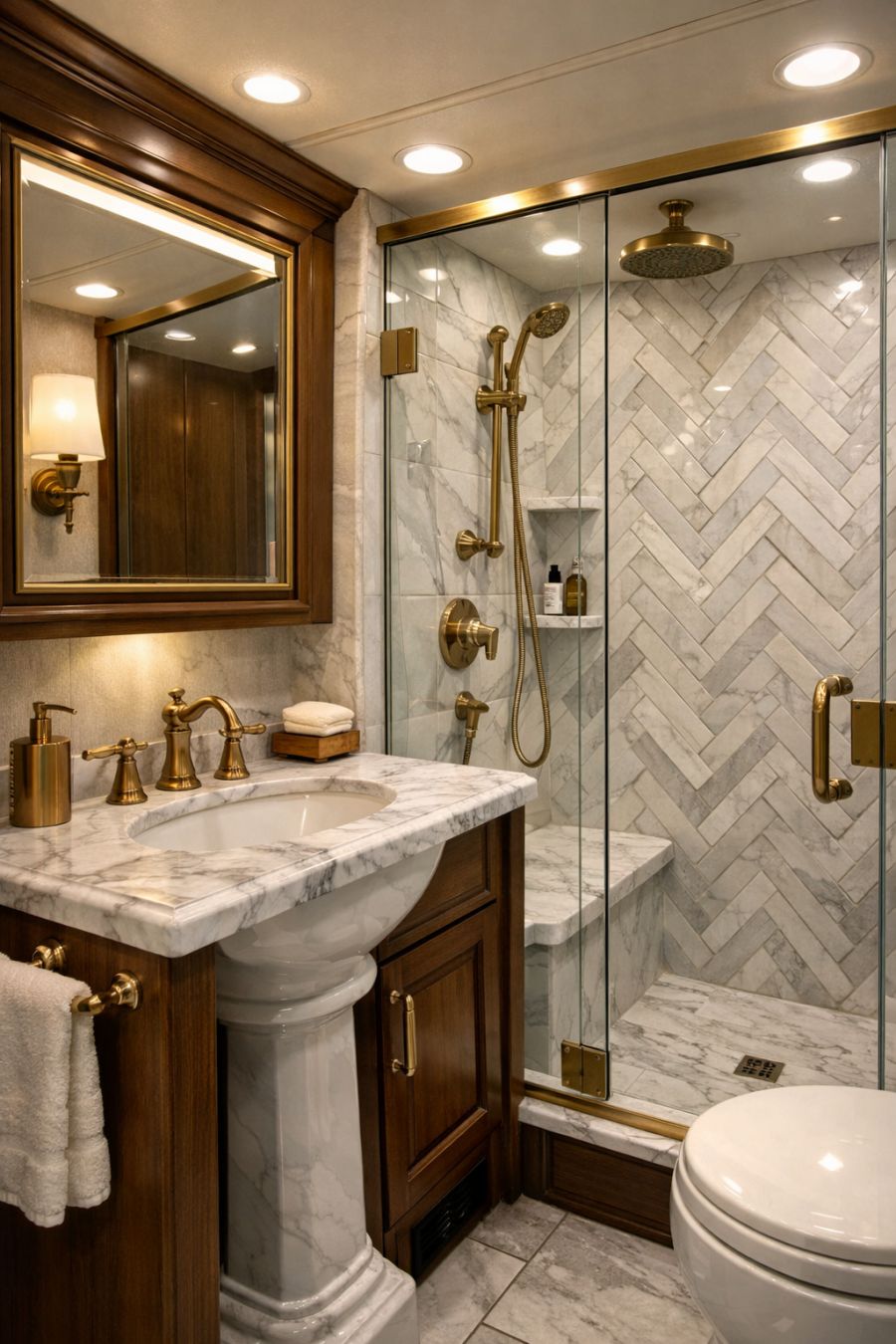 In the bathroom, luxury meets functionality with a design that emphasizes both style and practicality. Marble countertops and a classic pedestal sink create an elegant focal point, complemented by brass fixtures that add a touch of warmth. The shower area, enclosed with glass, features intricate tile work in a herringbone pattern, adding visual interest to the space. Soft, ambient lighting and a large mirror enhance the room's sense of space, creating a tranquil environment that invites relaxation.