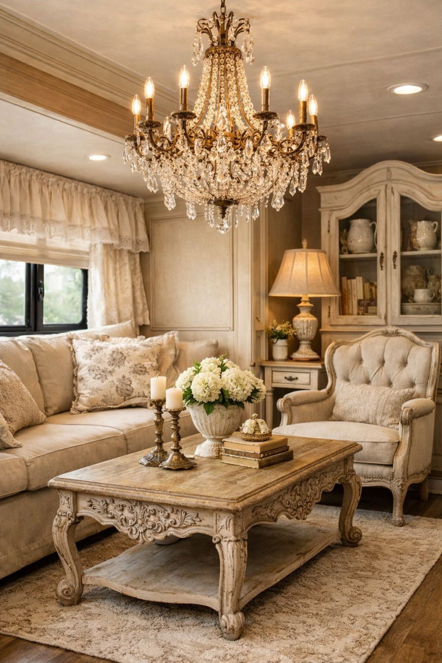 Stepping inside, the living area envelops you in the warmth of French country elegance. Soft, neutral tones dominate the space, with plush seating arranged to create an inviting atmosphere. The highlight of the room is the striking chandelier that hangs overhead, casting a gentle glow across the room and adding a touch of opulence. Vintage-inspired furniture pieces, such as an intricately carved coffee table and a cozy upholstered armchair, complete the sophisticated look, making this living area a perfect blend of comfort and refinement.