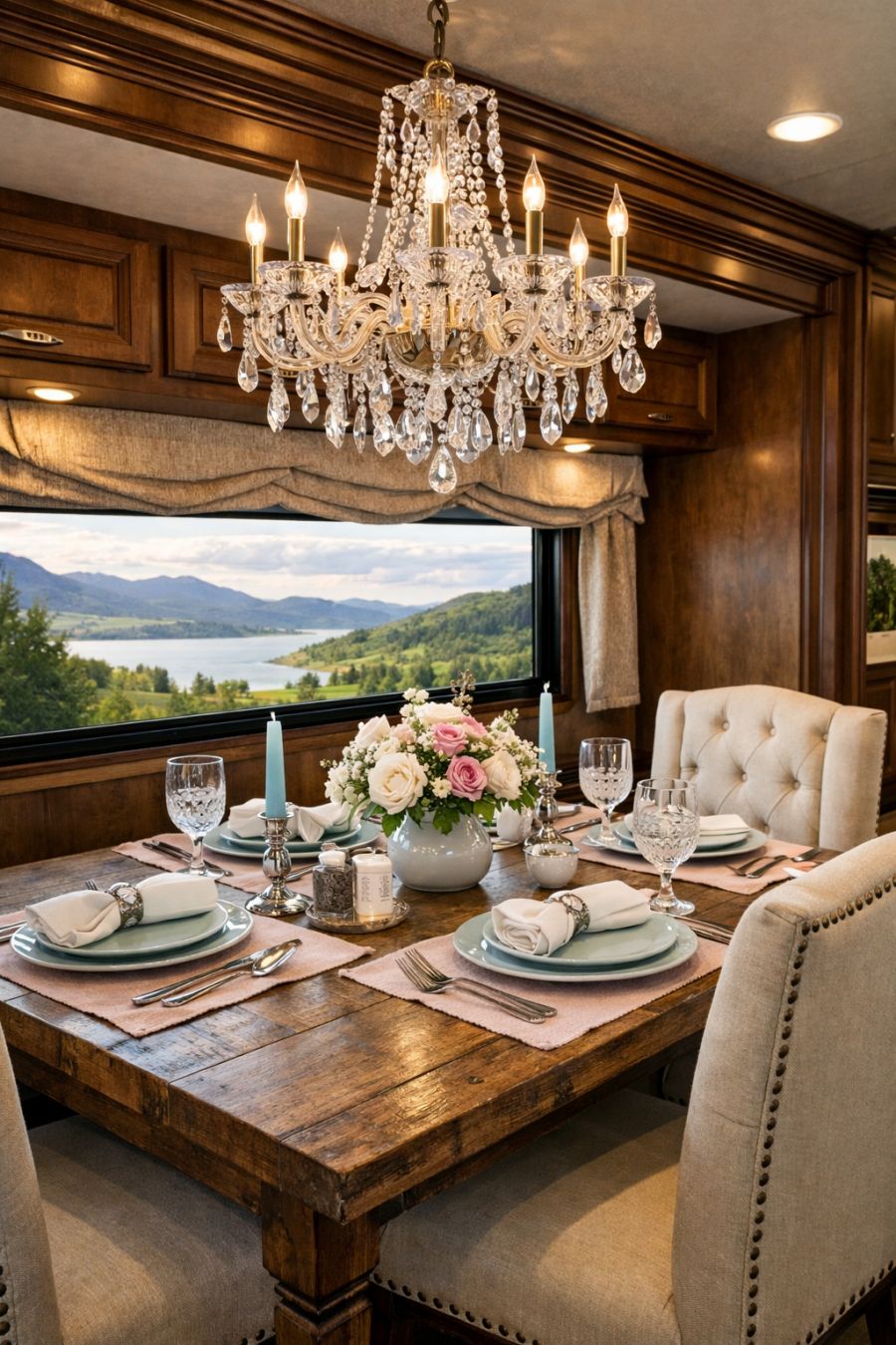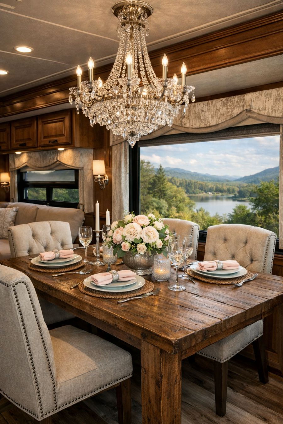 Adjacent to the living area, the dining space continues the theme of understated luxury. A solid wood dining table, with a distressed finish, serves as the centerpiece, surrounded by elegantly upholstered chairs. The chandelier above mirrors the one in the living area, tying the two spaces together with its sparkling presence. Delicate tableware and linen in pastel hues add a touch of classic charm, while a large window offers a picturesque view of the surrounding landscape, enhancing the dining experience with natural light and serene vistas.
