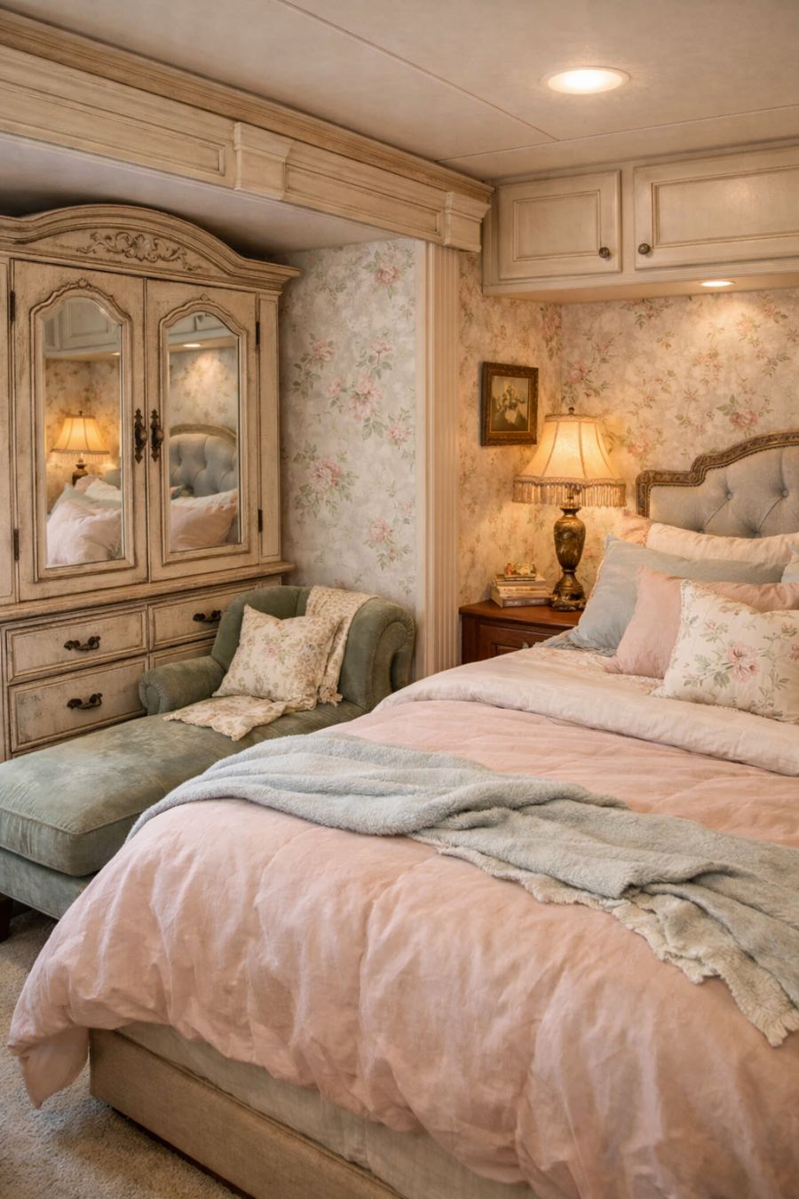 The bedroom area exudes tranquility and elegance, with a plush, king-sized bed as the focal point. Soft linens in pastel shades invite restful sleep, while an antique armoire provides storage with style. The walls are adorned with delicate floral wallpaper, enhancing the romantic ambiance. A small reading nook, complete with a velvet chaise lounge and a vintage lamp, offers a cozy retreat within the bedroom, making it a perfect haven for relaxation.