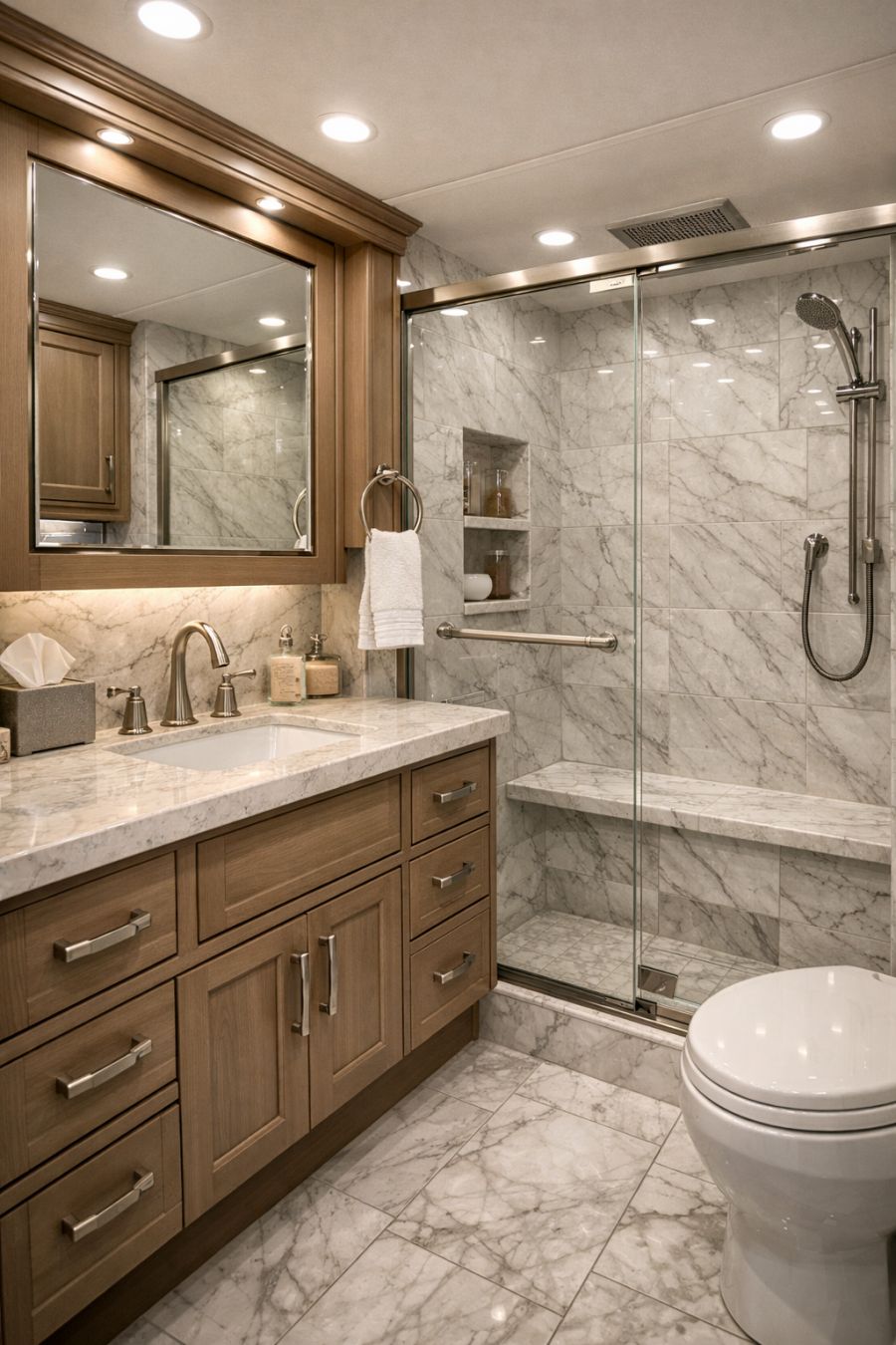 The bathroom is a sanctuary of calm and elegance, featuring high-quality materials and a thoughtful layout. Marble tiles line the floor and walls, contributing to a sense of opulence. The fixtures are sleek and modern, with a brushed nickel finish that complements the neutral color scheme. A spacious vanity offers ample storage, while a large mirror enhances the feeling of space. The shower, enclosed in glass, provides both practicality and style, ensuring the bathroom is as functional as it is beautiful.