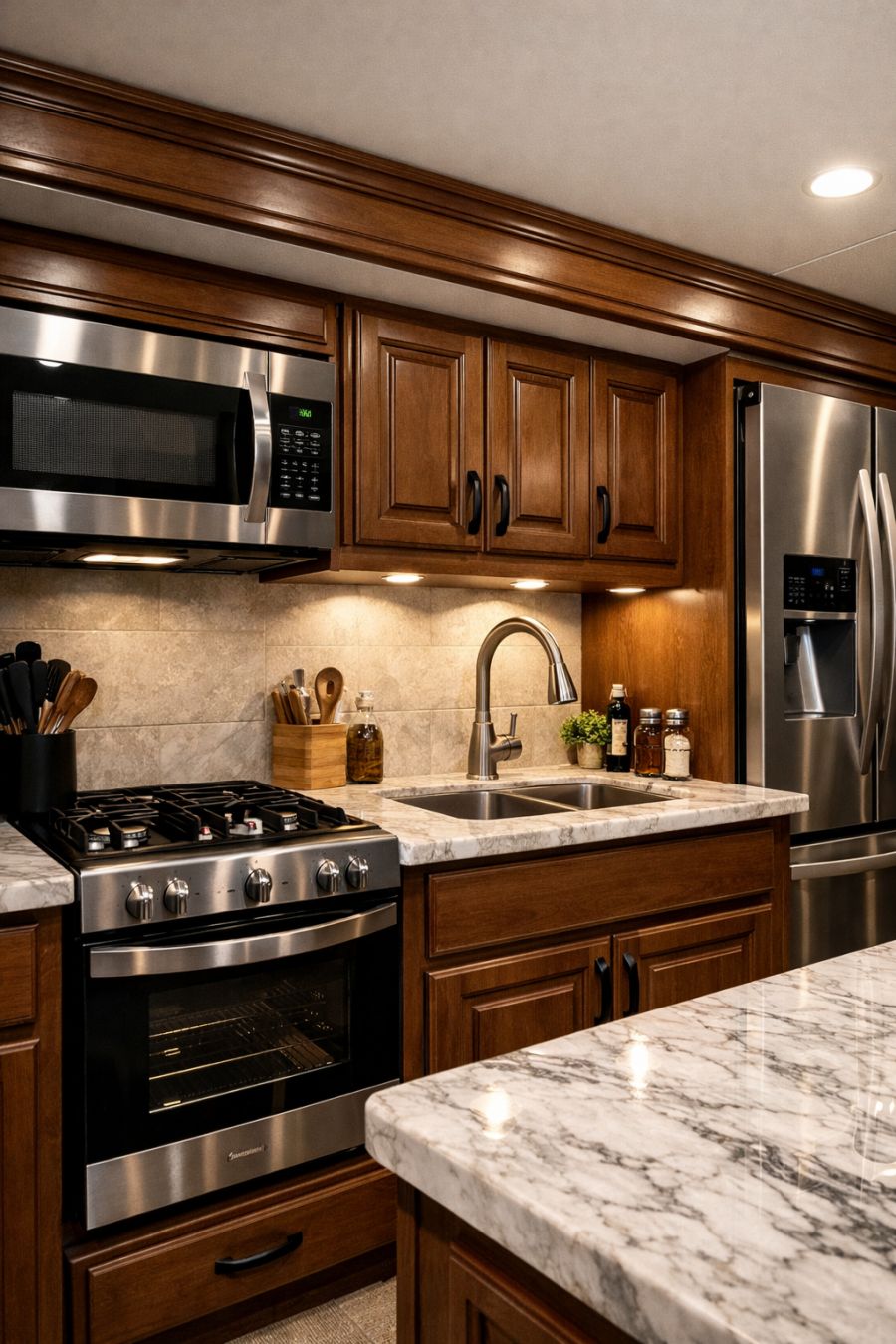 The kitchen area is a perfect blend of functionality and style. Sleek, modern appliances are seamlessly integrated into the traditional wood cabinetry, maintaining the classic aesthetic. The countertops are crafted from polished marble, adding a touch of luxury. Subtle lighting under the cabinets provides both task illumination and a warm ambiance, making the kitchen a delightful space for culinary creation.