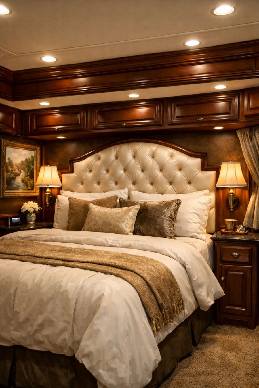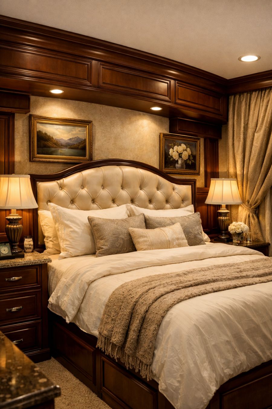 Living in this RV camper would appeal to those who appreciate the blend of simplicity and luxury. It offers a unique opportunity to live in a space that defies expectations, with a sophisticated interior hidden within a modest exterior. The design provides both functionality and elegance, making it ideal for individuals who value both aesthetics and practicality. Whether it's the allure of a traditional library or the comfort of a well-appointed bedroom, this home offers a distinctive living experience that embraces the unexpected.