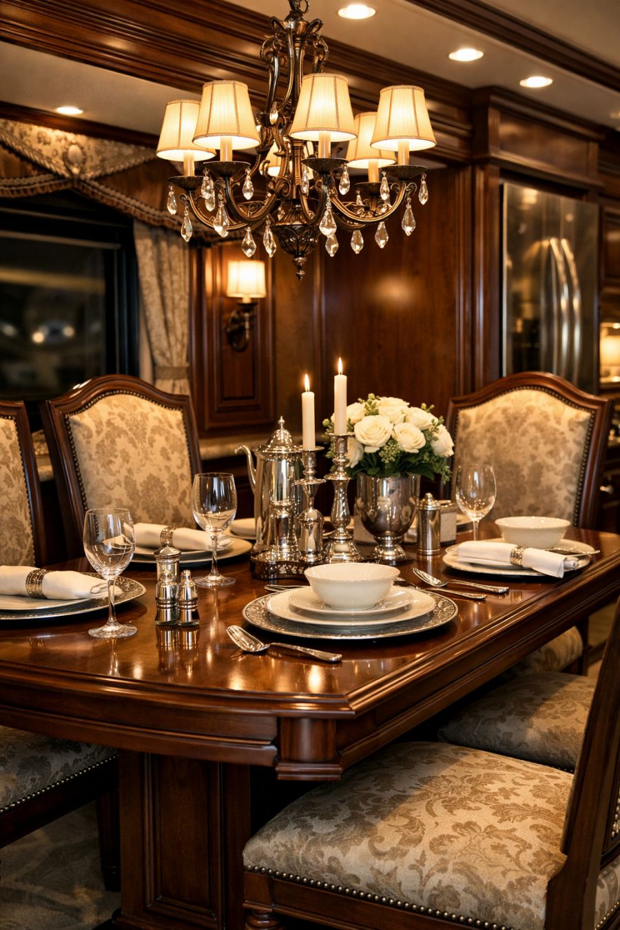 The dining area continues the theme of elegance and sophistication. A beautifully crafted wooden dining table serves as the centerpiece, surrounded by high-backed chairs upholstered in luxurious fabric. The lighting is soft and ambient, with a tasteful chandelier casting a warm glow over the space. Accents of polished silver and fine china adorn the table, creating an atmosphere reminiscent of a grand, old-world dining experience.