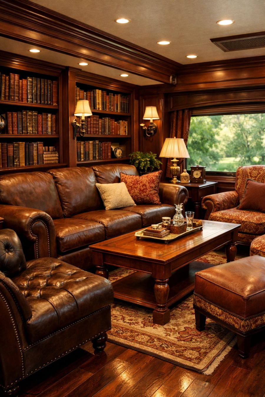 Upon entering, visitors are greeted by a living area that exudes sophistication and style. Rich hardwood floors complement the elegant traditional library interior, with built-in bookshelves lined with leather-bound volumes. The use of deep, warm colors creates an inviting and cozy atmosphere, while classic, comfortable furniture pieces invite relaxation. Large windows allow natural light to flood the space, enhancing the warm tones and highlighting the intricate detailing of the woodwork.