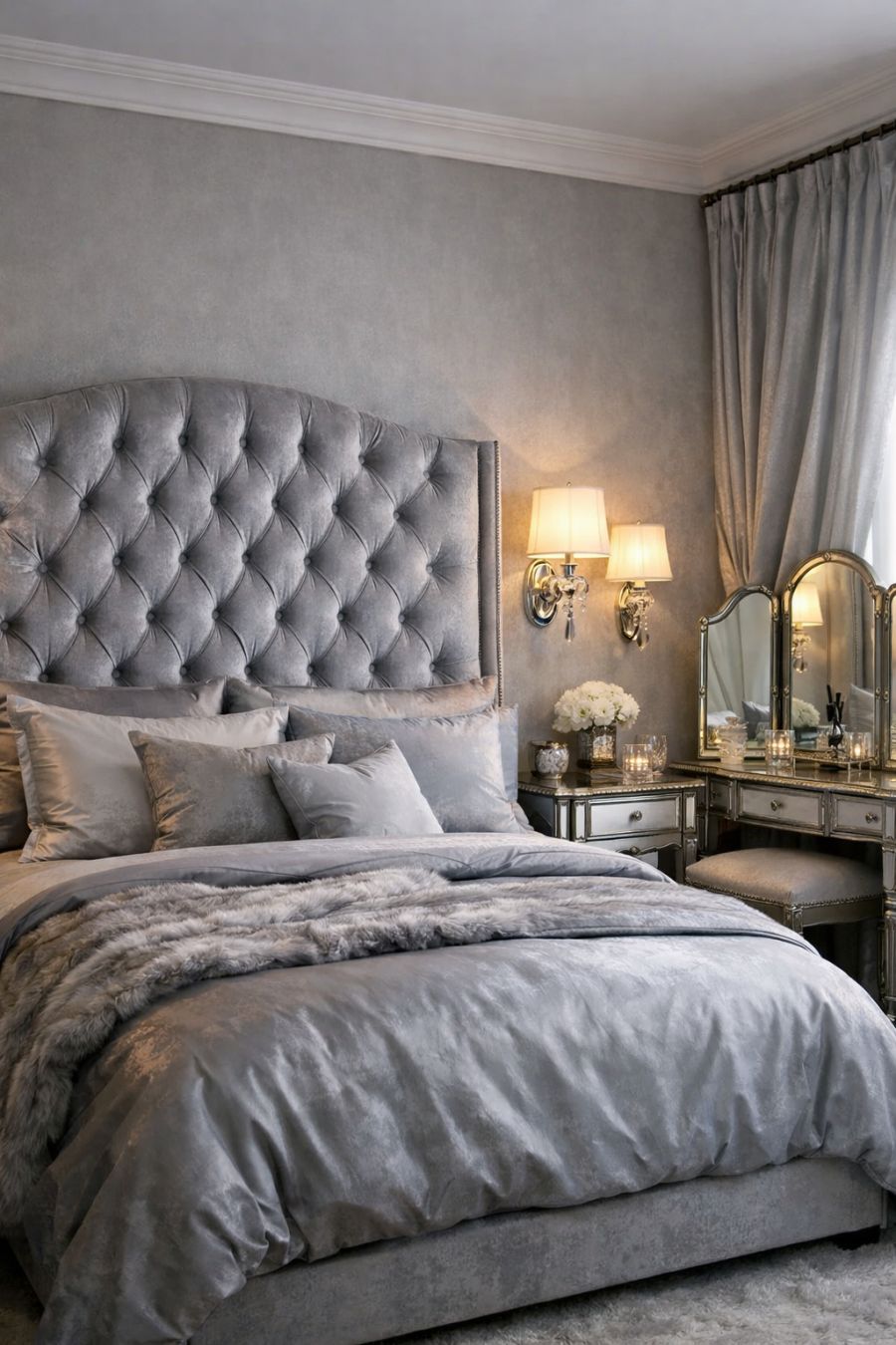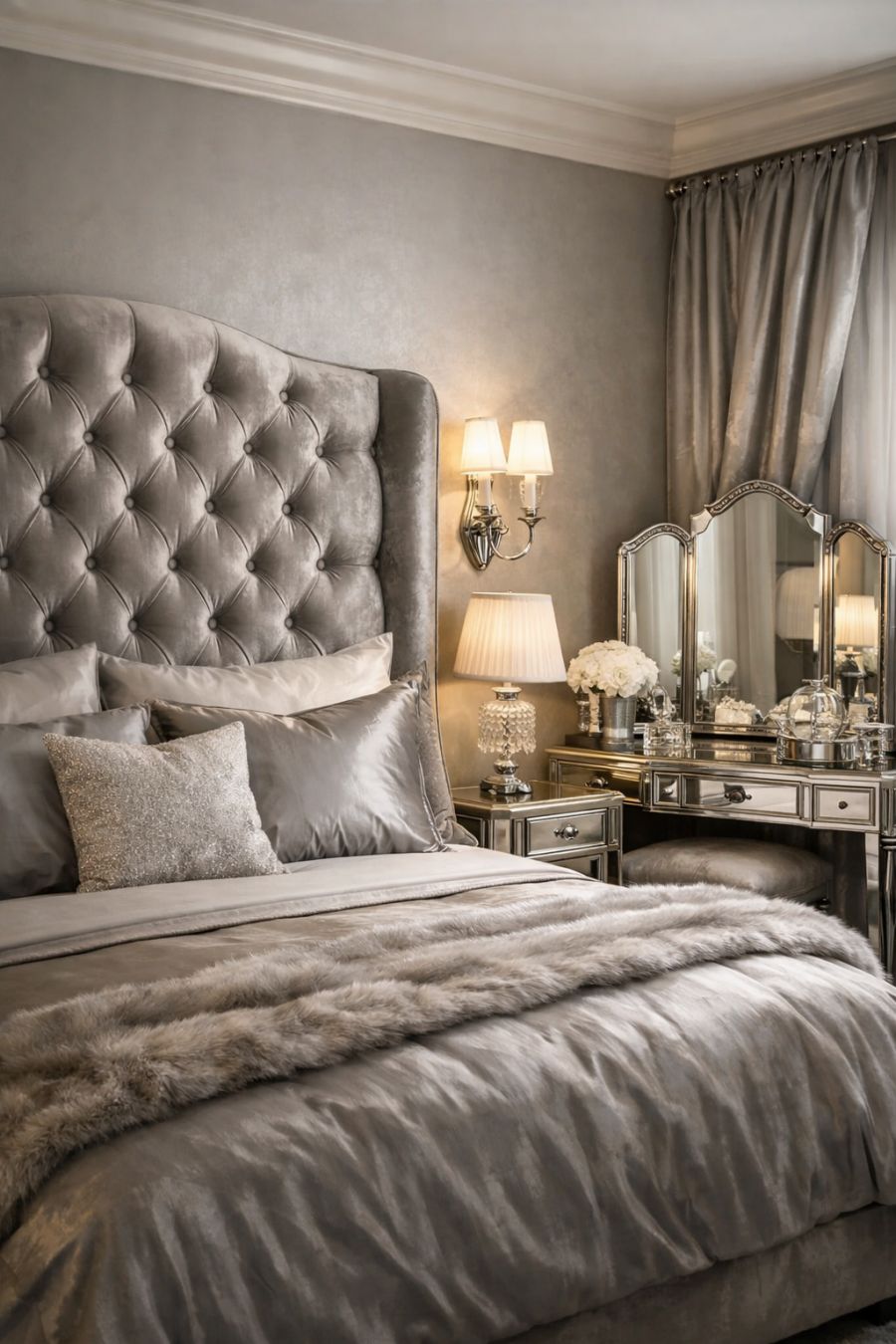The bedroom is a serene sanctuary, designed with a touch of Hollywood opulence. A grand, tufted headboard in plush velvet dominates the room, setting the tone for relaxation and luxury. The color palette is a soothing blend of soft grays and silvers, creating a calm and inviting atmosphere. Art Deco-inspired bedside tables with mirrored surfaces reflect the ambient light from elegant wall sconces, while a vintage vanity table adds a touch of nostalgia. The room is finished with sumptuous drapery, ensuring privacy and comfort.