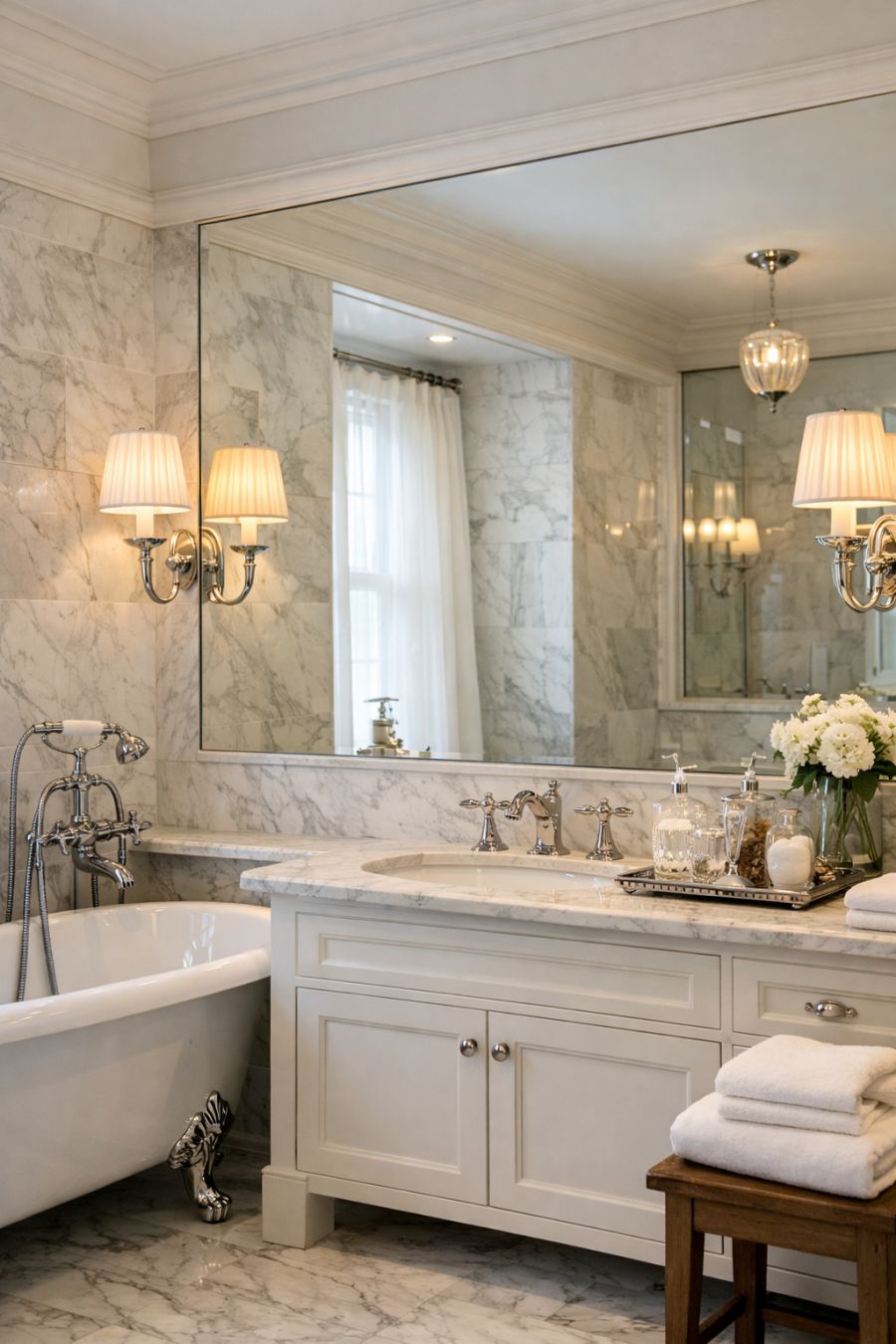 The bathroom is a study in elegance and functionality, where classic design meets modern amenities. Marble floors and walls create a seamless, luxurious backdrop, complemented by a freestanding clawfoot tub that invites indulgence. Chrome fixtures add a sleek, contemporary edge, harmonizing beautifully with the vintage-inspired design elements. A large, frameless mirror spans the length of the vanity, enhancing the room's brightness and sense of space. The carefully curated lighting, featuring soft, ambient sconces, completes the bathroom's sophisticated yet serene ambiance.
