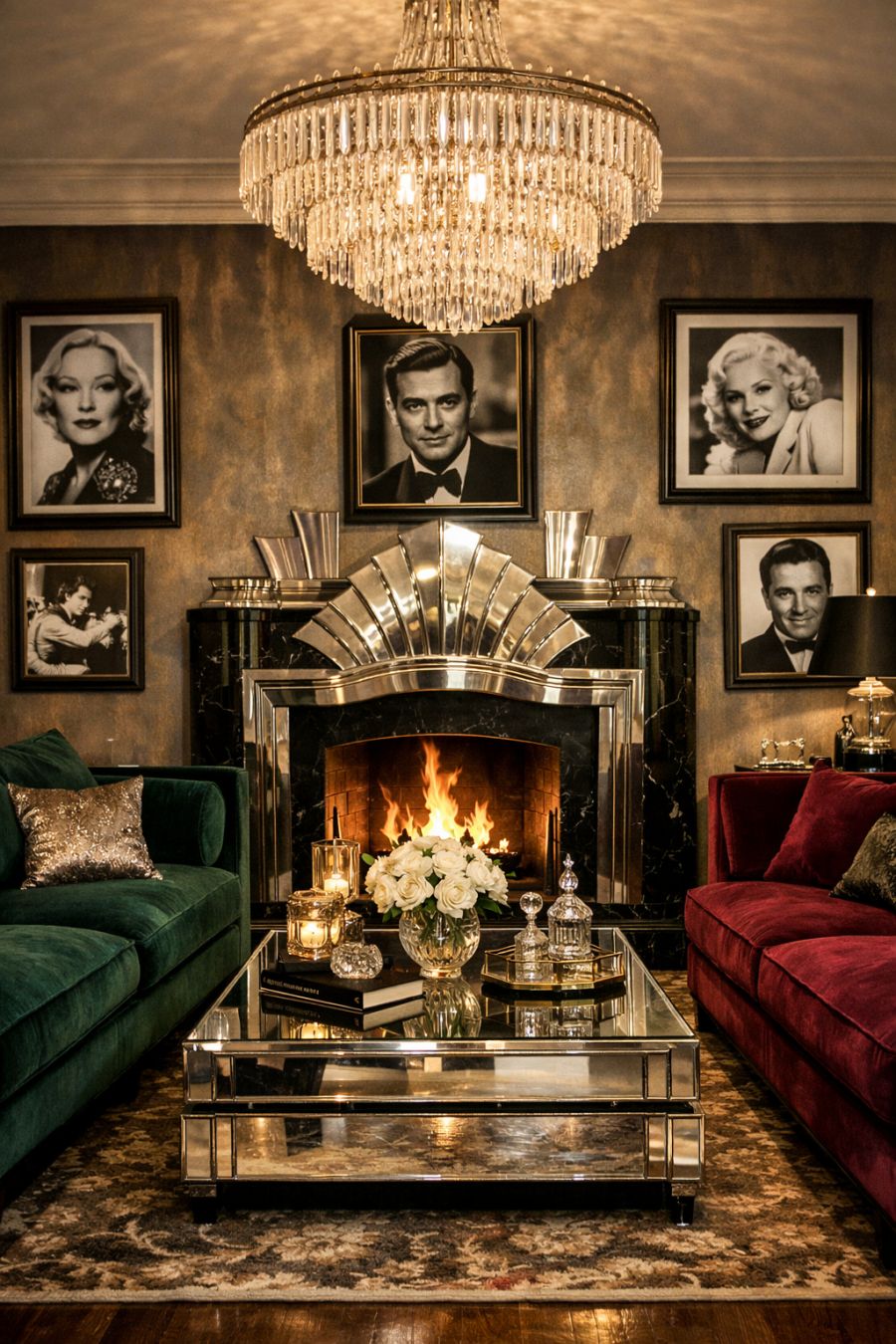 Stepping inside, the living area transports you to the golden age of Hollywood with its 1930s Regency flair. The room is anchored by an ornate, Art Deco-inspired fireplace that serves as the focal point. Luxurious velvet sofas in jewel tones are paired with mirrored coffee tables, creating an ambiance of understated elegance. The walls are adorned with vintage black-and-white photographs of Hollywood icons, their presence amplifying the room’s glamorous theme. A crystal chandelier hangs overhead, casting a gentle glow that accentuates the room's sophisticated details.