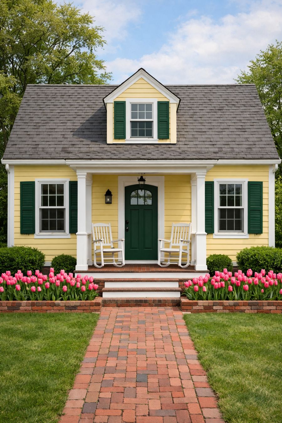 Nestled within a picturesque setting, this Cape Cod cottage exudes a welcoming charm with its buttermilk yellow wood siding, a color choice that pays homage to traditional New England homes while adding a touch of whimsy. The hunter green accents and shutters provide a striking contrast, evoking a sense of harmony with nature. A small porch, adorned with classic rocking chairs, invites you to sit back and enjoy the tranquility of the surroundings. Along the brick foundation, vibrant pink tulip beds are in full bloom, adding a splash of color that enhances the cottage’s quaint allure.
