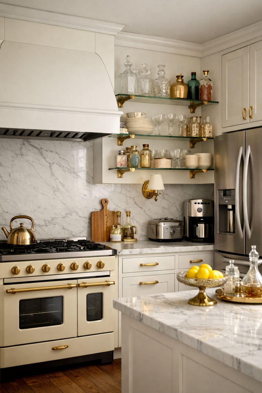In the kitchen, modern functionality meets vintage style. Custom cabinetry in a glossy, white lacquer finish is complemented by gold hardware, reminiscent of the glitz and glamor of the 1930s. The countertops, made of polished marble, offer a luxurious workspace that is both practical and stylish. A retro-style range cooker in a soft cream hue serves as a nod to the past, while state-of-the-art stainless steel appliances ensure contemporary convenience. Open shelving displays a curated selection of vintage glassware, adding a personal touch to the room’s sleek design.