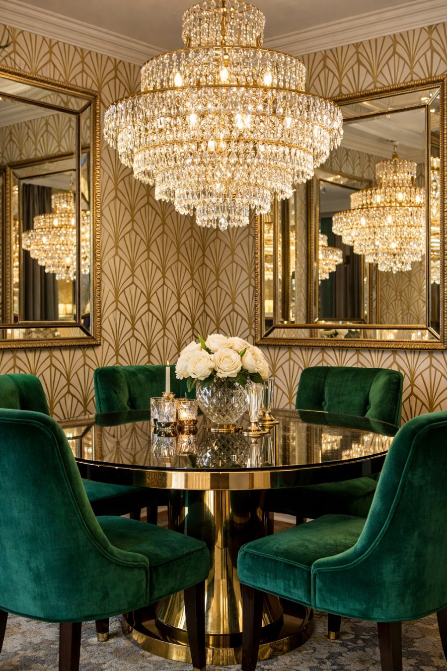 The dining area continues the Hollywood Regency theme with a dramatic flair. A round, glass-top dining table sits beneath an opulent, multi-tiered chandelier that glimmers like a constellation. Surrounding the table are plush dining chairs upholstered in a rich, emerald green fabric, echoing the lushness of old Hollywood. The walls feature a geometric wallpaper in gold and cream, adding depth and texture to the space. Large, framed mirrors strategically placed create an illusion of space, reflecting the light and enhancing the room's glamorous feel.