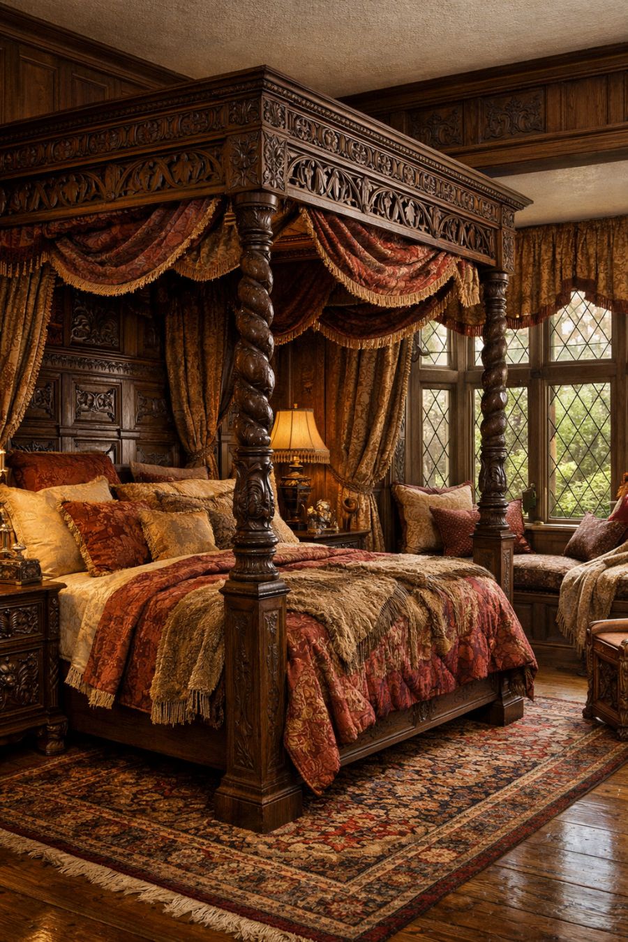 In the bedroom, the carved oak Tudor theme continues with a grand four-poster bed as the centerpiece. The bed is draped with rich, textured fabrics that add layers of warmth and comfort. The room features a large bay window seat, perfect for reading or enjoying the view of the garden outside. Heavy drapes and a plush area rug further enhance the cozy, regal atmosphere, making the bedroom a true sanctuary.