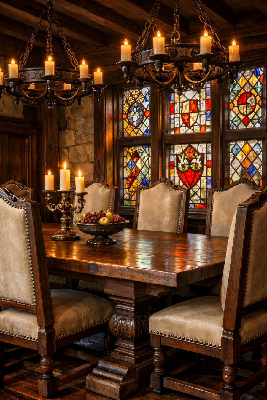 The dining area continues the theme of Tudor grandeur with a large oak dining table that commands attention. Tall, upholstered chairs surround the table, offering a comfortable yet regal dining experience. Stained glass windows filter the sunlight, casting colorful patterns across the room and adding to the sense of historical richness. Iron chandeliers hang overhead, their warm glow enhancing the room's medieval ambiance.