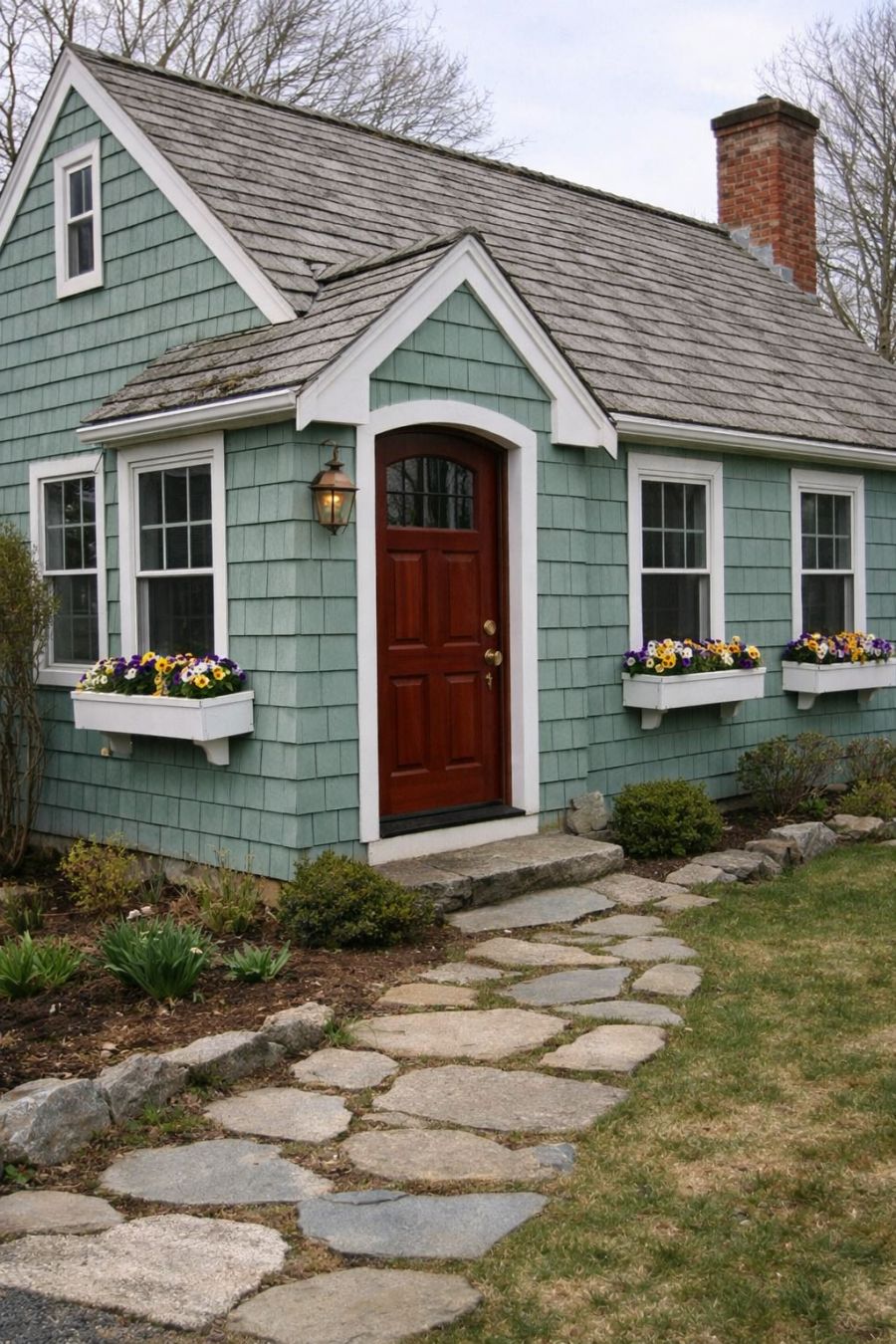 From the outside, this seafoam green shingle Cape Cod cottage exudes a sense of tranquility and charm. The rich mahogany door stands as a striking focal point, inviting you into a world of wonder. White painted window boxes brimming with early spring pansies add a splash of vibrant color, perfectly complementing the serene green hue of the shingles. A neat stone walkway guides visitors to the front entrance, setting the stage for the cottage's storybook appeal, as captured beautifully in an amateur photograph.