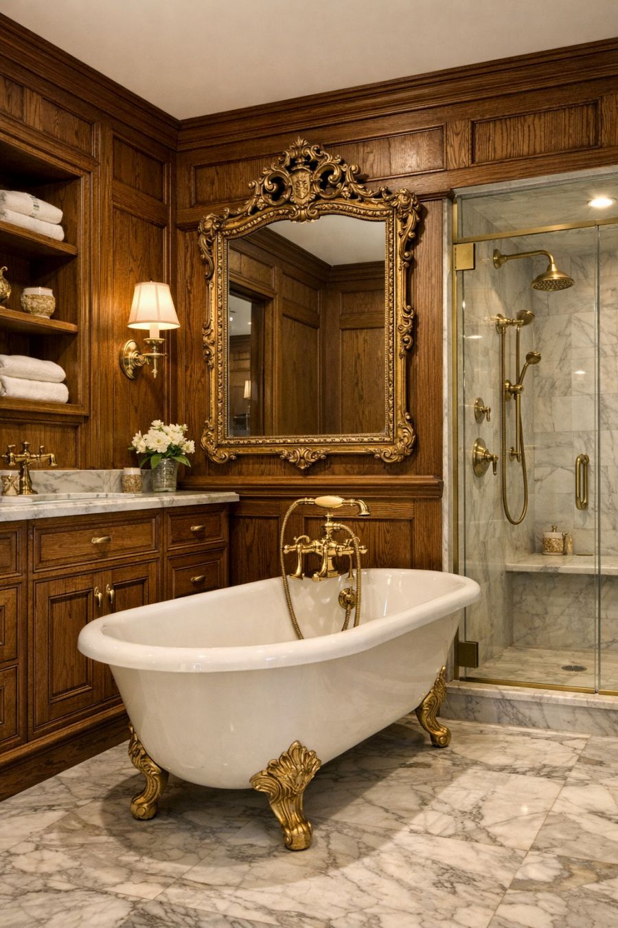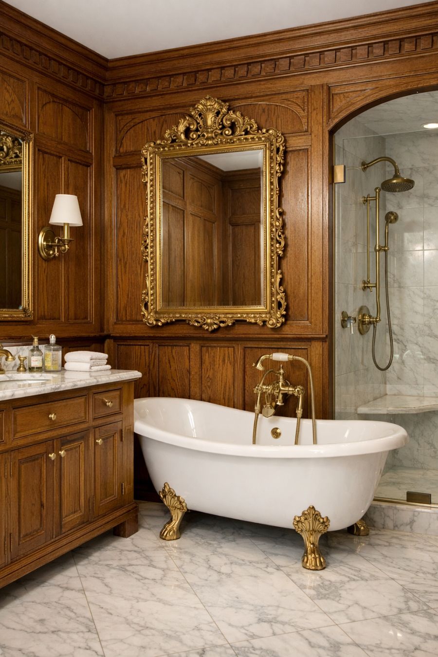 The bathroom combines elegance and functionality, featuring marble floors and a clawfoot tub that invites relaxation. The walls are adorned with oak paneling, echoing the Tudor theme found throughout the house. Brass fixtures and a large, ornately framed mirror add a touch of opulence. The layout is designed for convenience, with ample storage space and a spacious shower that offers modern comfort while maintaining the room's historical feel.
