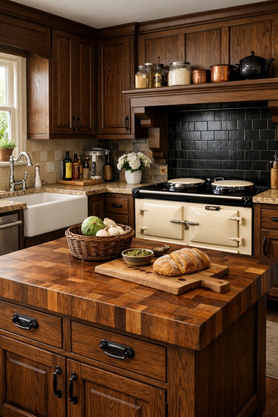 The kitchen is a blend of modern functionality and classic design, with dark oak cabinetry providing ample storage space. Granite countertops offer a touch of luxury, while the latest stainless steel appliances ensure all modern cooking needs are met. A large farmhouse sink and a classic AGA stove reinforce the room's old-world charm. The kitchen island, topped with butcher block, serves as both a practical workspace and a gathering spot for family and friends.