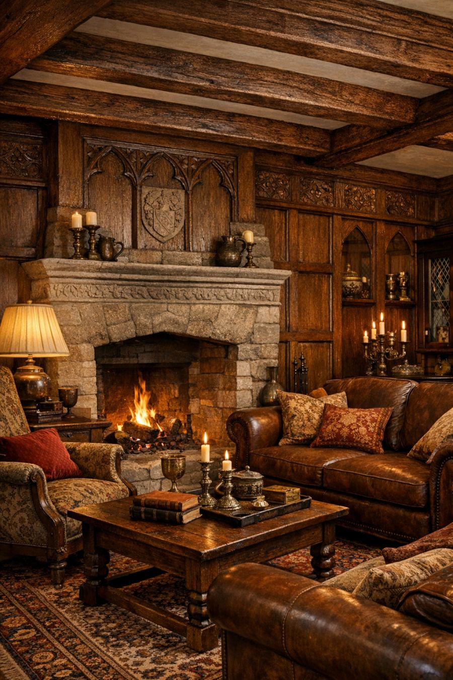 Stepping through the mahogany door, visitors are immediately enveloped in the warmth and elegance of a carved oak Tudor interior. The living area is a testament to craftsmanship, with intricate woodwork adorning the walls and ceilings. Rich oak beams stretch across the ceiling, creating a striking contrast with the lighter shades of the walls. Antique furnishings and a grand stone fireplace anchor the room, exuding a sense of timeless elegance and inviting guests to sit and stay awhile.