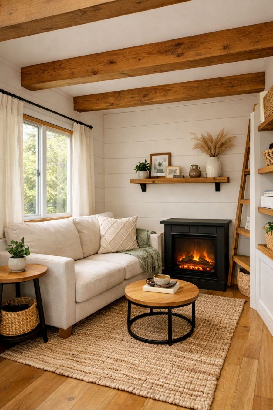 Upon entering the tiny home, you are greeted by a living area that feels surprisingly spacious, thanks to clever design choices. The walls are adorned with light, neutral tones that enhance the natural light streaming through the large windows. A cozy loveseat sits against one wall, complemented by a woven area rug that adds texture and warmth. Above, exposed wooden beams lend an air of rustic charm, while a compact electric fireplace adds both ambiance and warmth to the space.