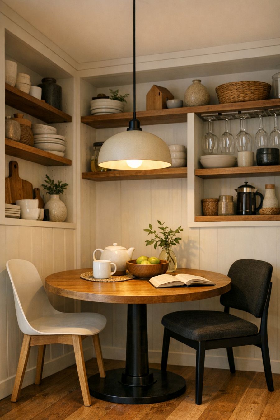 The dining area, though compact, is a model of efficiency and style. A small, round table with a natural wood finish sits beneath a pendant light that casts a warm glow during meals. Two minimalist chairs accompany the table, offering a comfortable spot for dining or working. The walls are lined with built-in shelves, perfect for displaying decorative items or storing dinnerware, adding both function and flair to the space.