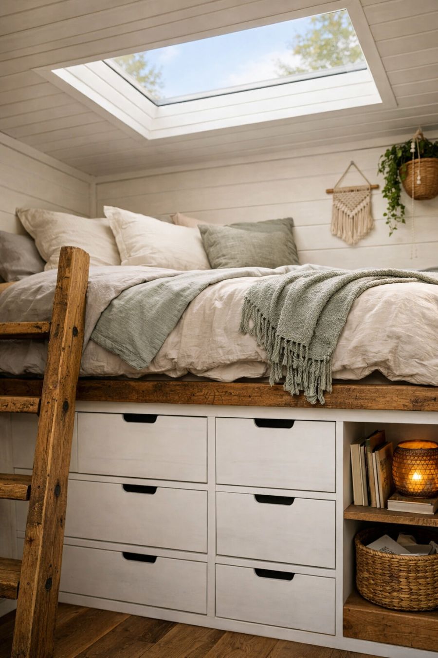 The bedroom area is designed to be a tranquil retreat within the tiny home. A lofted sleeping area maximizes the use of space, accessed by a sturdy ladder crafted from reclaimed wood. The mattress is adorned with soft linens in muted tones, inviting rest and relaxation. Underneath, a series of built-in drawers offer clever storage solutions, keeping the room tidy and clutter-free. Natural light filters through a skylight above, creating a serene and airy atmosphere.