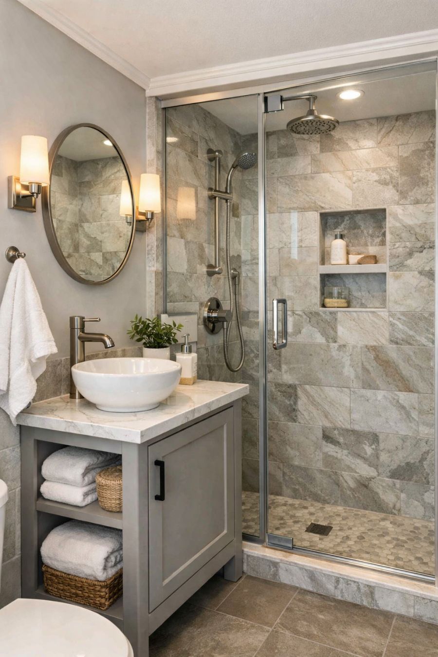 The bathroom, though compact, is designed with both elegance and efficiency in mind. The space features a walk-in shower with glass doors, providing a sense of openness while maintaining privacy. The shower walls are lined with natural stone tiles, bringing an element of spa-like luxury. A petite vanity with a vessel sink sits beside the shower, offering storage and style in one. The color palette of soft grays and whites creates a soothing environment, perfect for beginning or ending the day with a sense of calm.