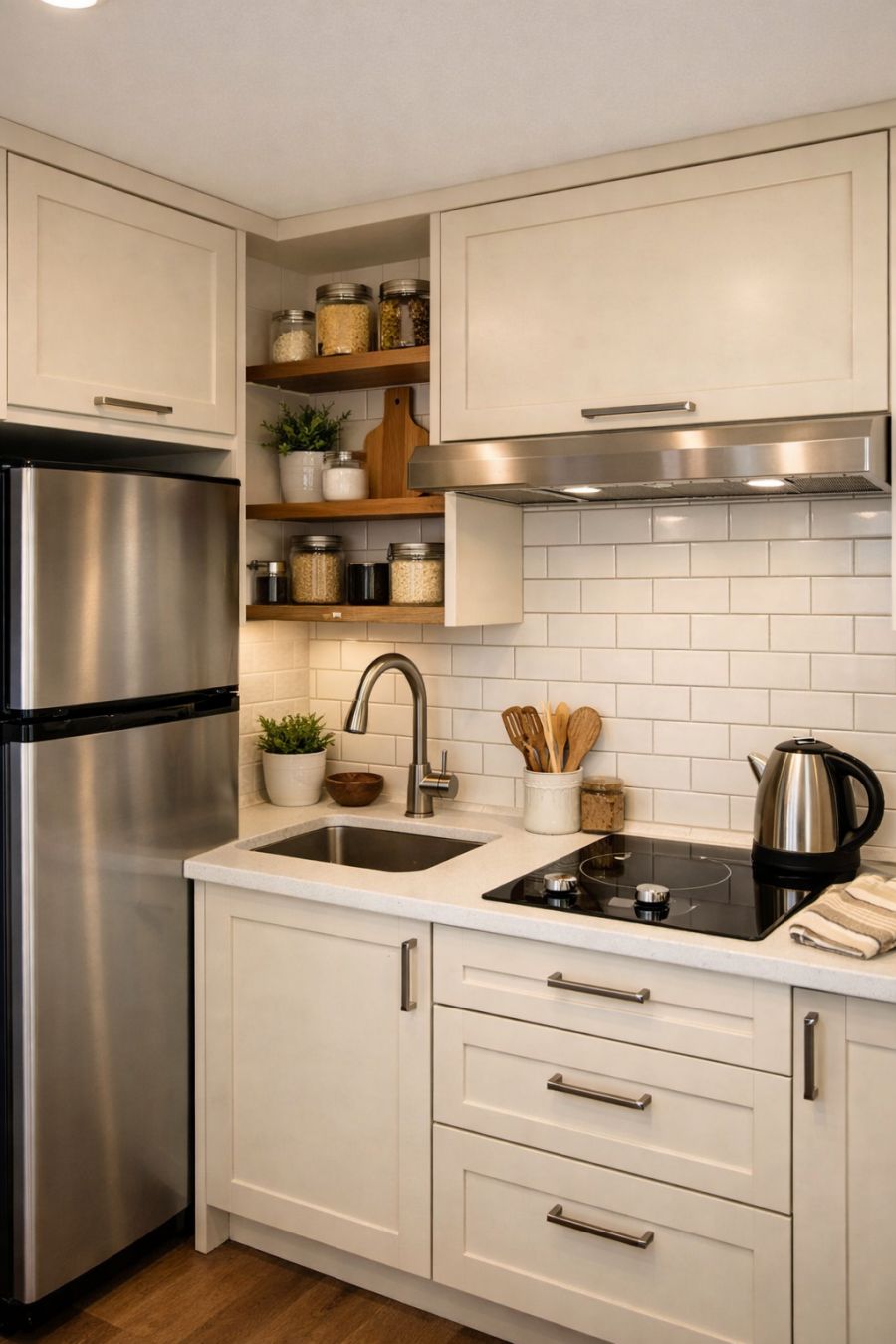 The kitchen, tucked neatly into one corner of the home, is a marvel of modern design. Sleek cabinets in a soft cream color provide ample storage, while the countertops are a durable quartz, lending both beauty and practicality. Stainless steel appliances, including a compact refrigerator and a two-burner cooktop, ensure that all culinary needs are met. A subway tile backsplash adds a classic touch, tying the kitchen's elements together seamlessly.