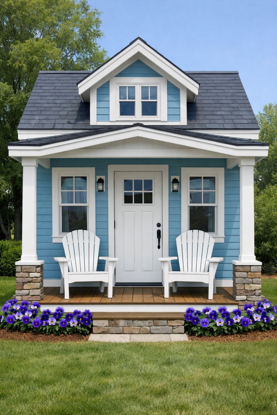 The exterior of this captivating tiny home is painted in a soothing robin egg blue, providing a serene and welcoming aura. The crisp white trim accentuates the cottage's classic lines, creating a striking contrast with the soft blue walls. At the base, a faux stone skirting adds a touch of rustic elegance, grounding the home in its natural surroundings. The tiny front patio, adorned with two white Adirondack chairs, invites you to relax and enjoy the sight of vibrant purple pansies planted along the perimeter, adding a splash of color and life to the scene.