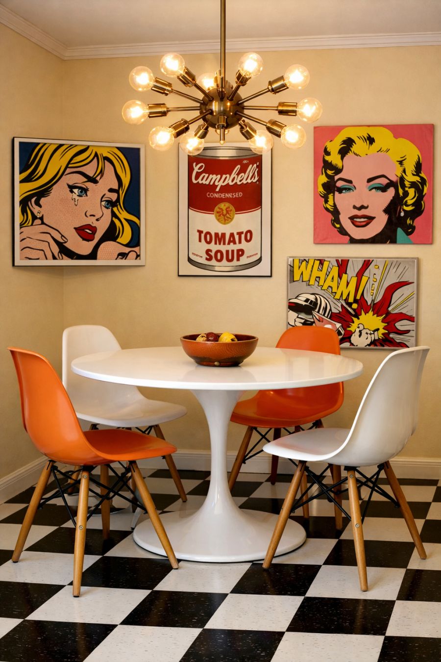 The dining area continues the retro theme, with a round, tulip-style dining table at its center, surrounded by Eames-inspired chairs that offer comfort and style. The walls are adorned with iconic pop art prints, bringing a splash of color and personality to the space. A Sputnik chandelier hangs overhead, casting a warm glow and serving as a focal point that ties the room together. The flooring is a classic checkerboard pattern in black and white, grounding the space with a touch of vintage flair, while still complementing the overall design aesthetic.