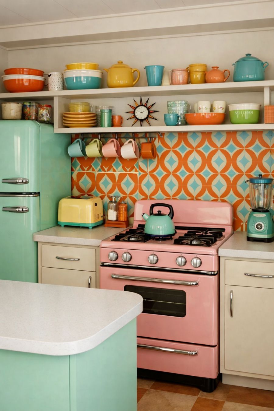 In the kitchen, the 1960s inspiration is evident in every detail, from the pastel-colored appliances to the sleek, minimalist cabinetry. The countertops are a smooth laminate, reminiscent of the era, providing both style and practicality. Open shelving displays an assortment of retro dishware and accessories, adding character and charm. A bold, patterned backsplash in shades of orange and turquoise brings a playful element to the space, while modern amenities ensure that the kitchen is as functional as it is stylish, blending the best of past and present.
