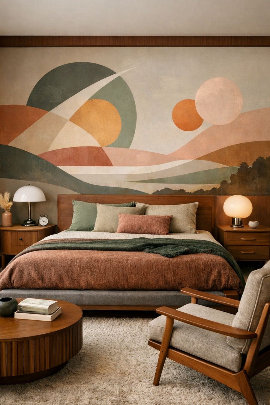 The bedroom offers a tranquil retreat with a nod to the space age design that permeates the home. A platform bed with a low profile and clean lines is dressed in rich, textured fabrics, creating a cozy yet sophisticated ambiance. The color palette is a soothing mix of earth tones and soft pastels, providing a calming contrast to the bolder hues found elsewhere in the house. A statement wall features a large, abstract mural, adding an artistic touch that draws the eye. Mid-century modern furniture completes the look, offering both form and function in this serene sanctuary.