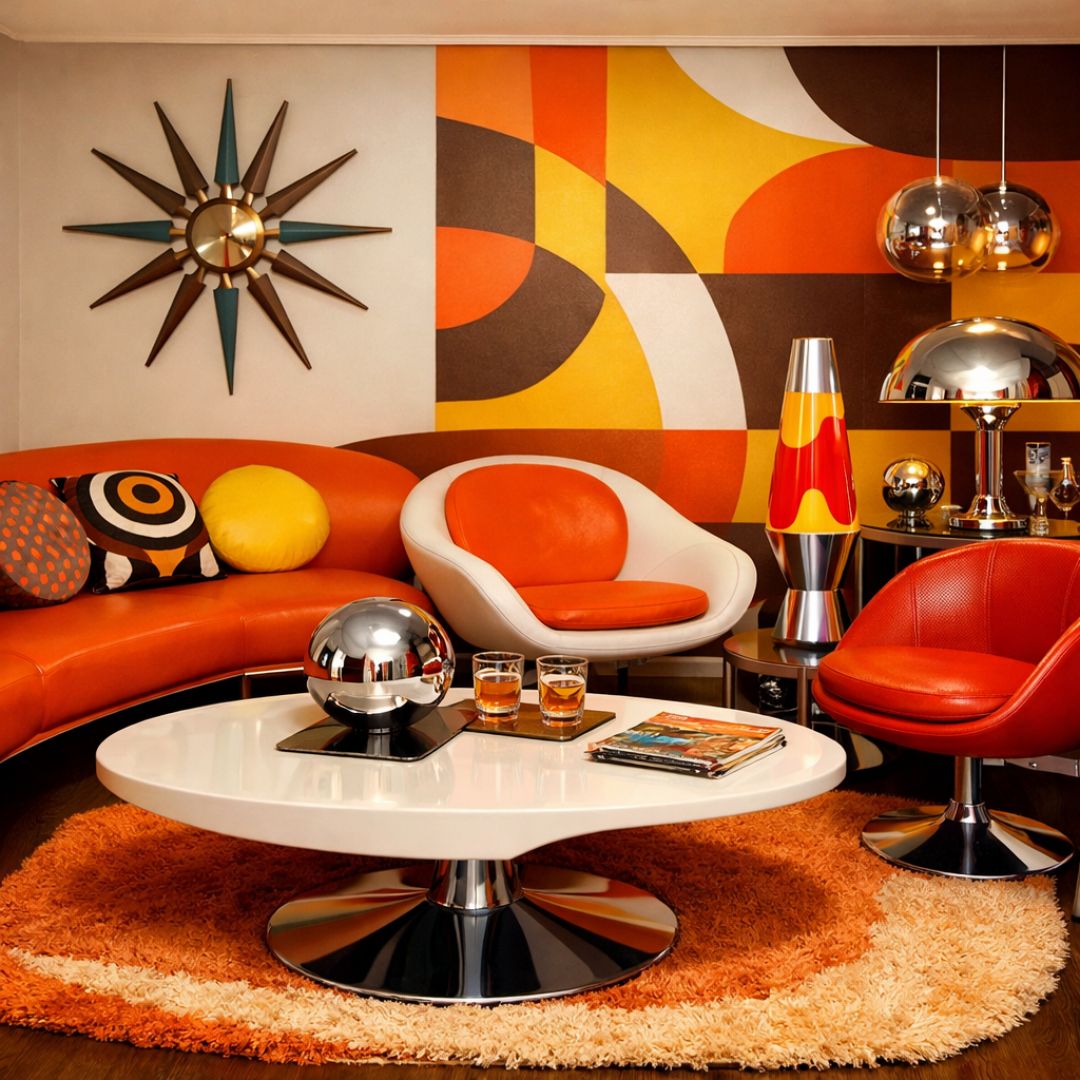Stepping inside, visitors are immediately transported to another era, as the living area embraces a space age 1960s retro interior. The room is adorned with bold geometric patterns and vibrant colors, creating an energetic atmosphere. Low-slung furniture with sleek lines and atomic-inspired shapes dominate the space, inviting guests to sit and marvel at the nostalgic design. A starburst clock and lava lamp further emphasize the retro theme, while the use of chrome and glass adds a futuristic touch, making this living area both a time capsule and a vision of the future.