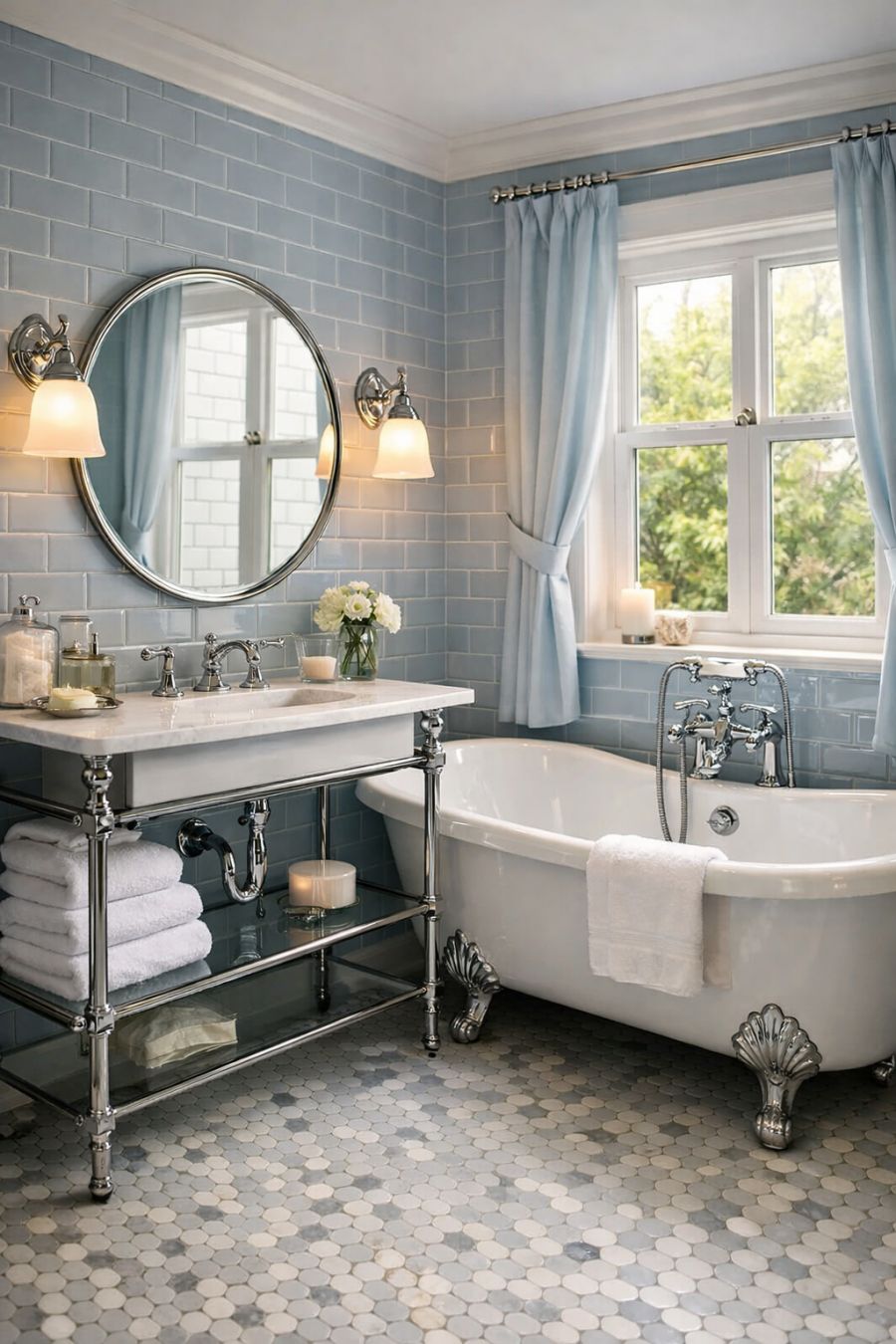 The bathroom is a study in retro elegance, featuring a combination of vintage-inspired fixtures and contemporary style. The walls are clad in glossy subway tiles, their reflective surface enhancing the sense of space and light. A freestanding tub with claw feet sits beneath a large window, offering a luxurious place to unwind. The vanity is a sleek, modern affair with a nod to the past, featuring chrome finishes and a round mirror that echoes the curves of the tub. Soft, ambient lighting and a palette of tranquil blues and whites create a spa-like atmosphere, making this bathroom a perfect blend of beauty and functionality.