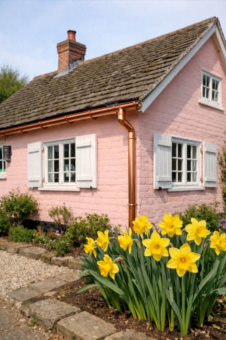 The exterior of this charming cottage is a delightful vision, painted in a soft pink hue that immediately catches the eye. Its shiny copper gutters add a touch of elegance, glistening in the sunlight and contrasting beautifully with the pastel tones of the bricks. The white window shutters frame each window perfectly, offering a crisp, clean aesthetic that complements the overall design. Nestled alongside the cottage, vibrant spring daffodils are in full bloom, adding a splash of color and life to the garden. This picturesque scene is captured through the lens of amateur photography, highlighting the home's inviting and quaint allure.