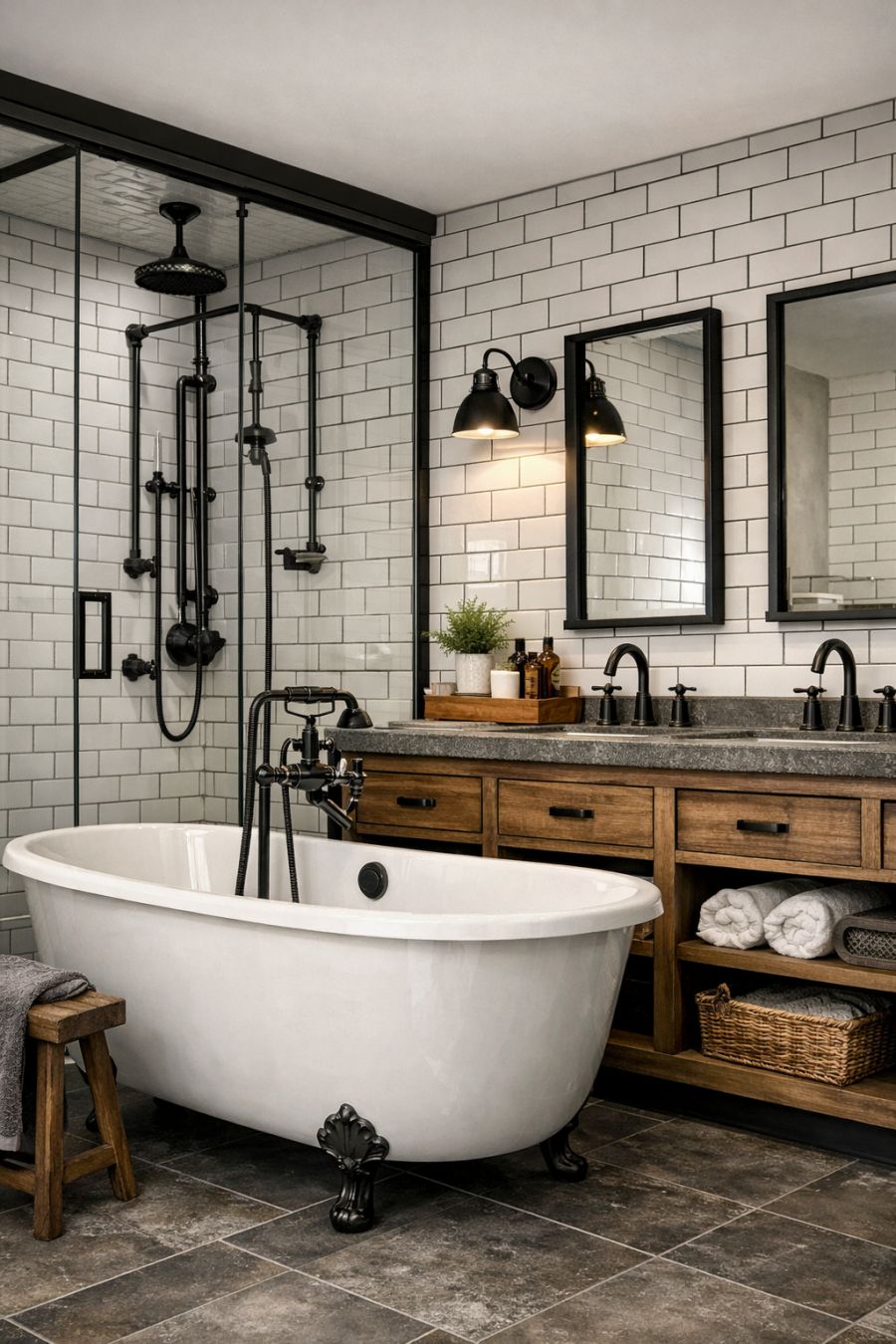 The bathroom is a study in industrial chic, featuring a mix of materials that create a luxurious yet utilitarian space. Walls clad in subway tiles contrast with sleek metal fixtures, while a large, freestanding tub takes center stage. A glass-enclosed shower with exposed plumbing adds to the industrial theme, and a wide vanity with a stone countertop offers ample storage. The neutral color palette is soothing, contributing to a sense of calm and relaxation.