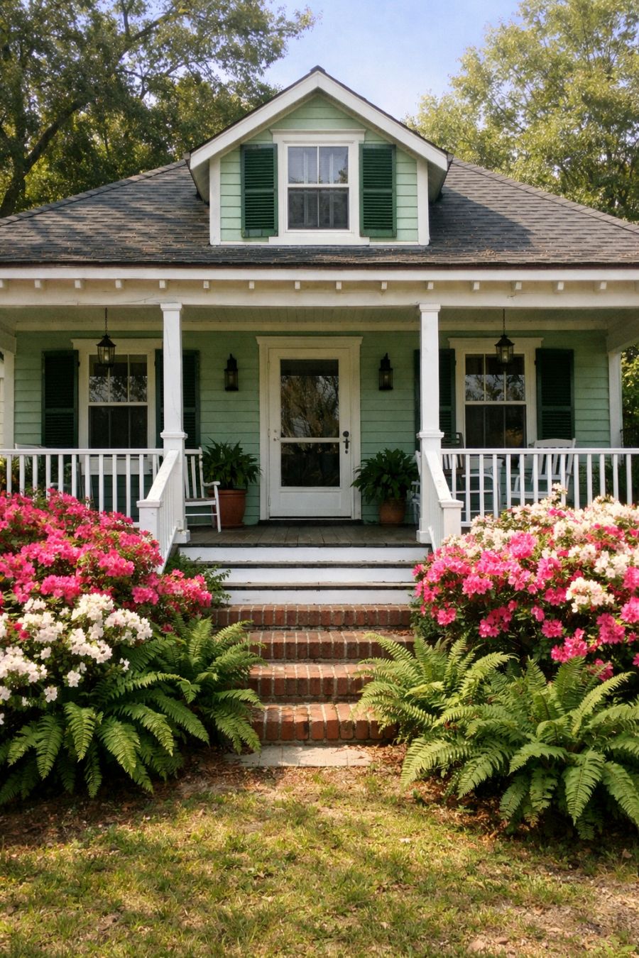 From the first glance, this cottage embodies southern charm with its mint green horizontal siding and dark green louvered shutters. The wide wrap-around porch invites you to sit and enjoy the surroundings, which are lush with ferns and vibrant with blooming azaleas. The amateur photography style of the image captures the essence of a quaint, welcoming home that seems plucked from a picturesque landscape. This exterior, with its harmonious color palette and thoughtful planting, creates a serene and inviting atmosphere that perfectly complements its natural setting.
