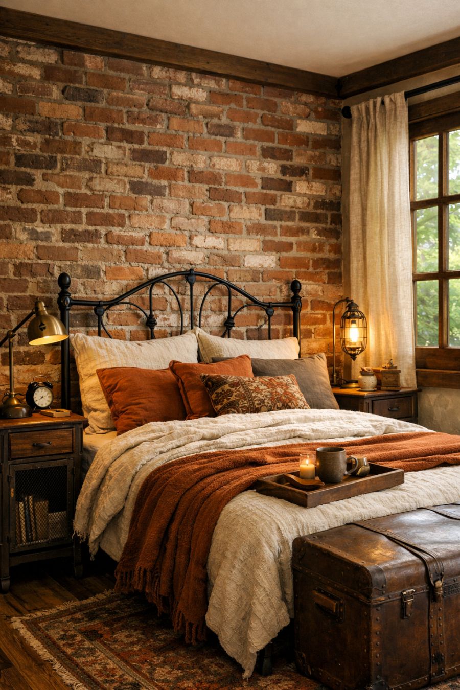 The bedroom offers a sanctuary of style, with exposed brick walls adding texture and warmth. A wrought iron bed frame serves as the room's focal point, surrounded by soft textiles and rich, earthy tones. Industrial-style bedside tables and vintage lamps complete the look, creating a space that is both restful and stylish. Large windows allow natural light to flood the room, enhancing its airy feel while maintaining the home’s cohesive design aesthetic.