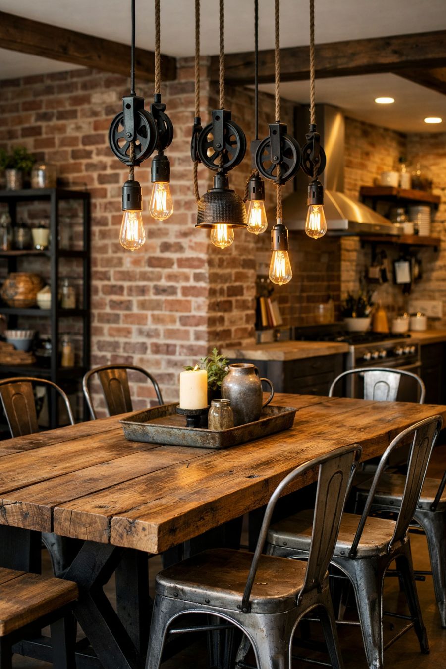 The dining area continues the industrial theme, with a large, reclaimed wood table serving as the centerpiece. Metal chairs with a distressed finish offer a touch of rugged elegance, while a series of pulley pendant lights hang overhead, casting a soft, ambient light. The exposed brick walls carry through from the living area, providing continuity in design and texture. An open layout ensures that the dining space feels integrated with the rest of the home, perfect for entertaining and everyday meals alike.